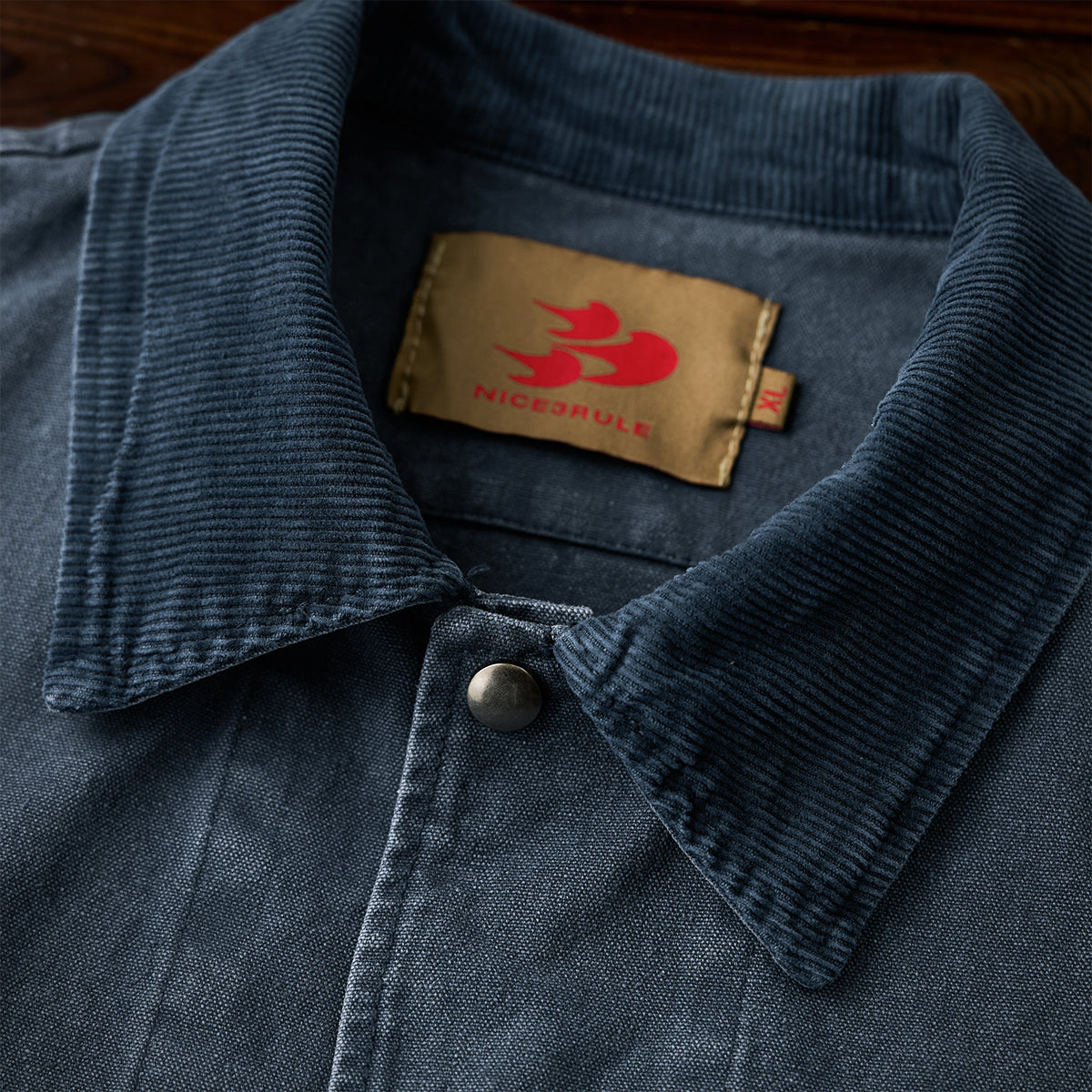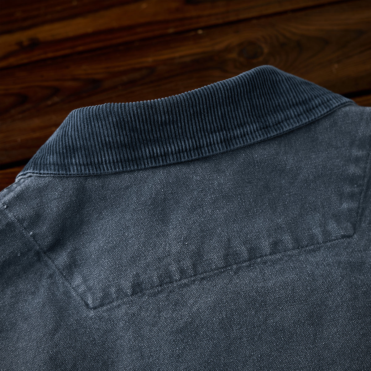 コーデュロイ襟・袖裏は異素材の組み合わせにより、質感のコントラストを生んでいます。ドロップショルダーのデザインが採用されている可能性が高く、トレンドのストリートウェアやカジュアルなルックにマッチします。