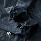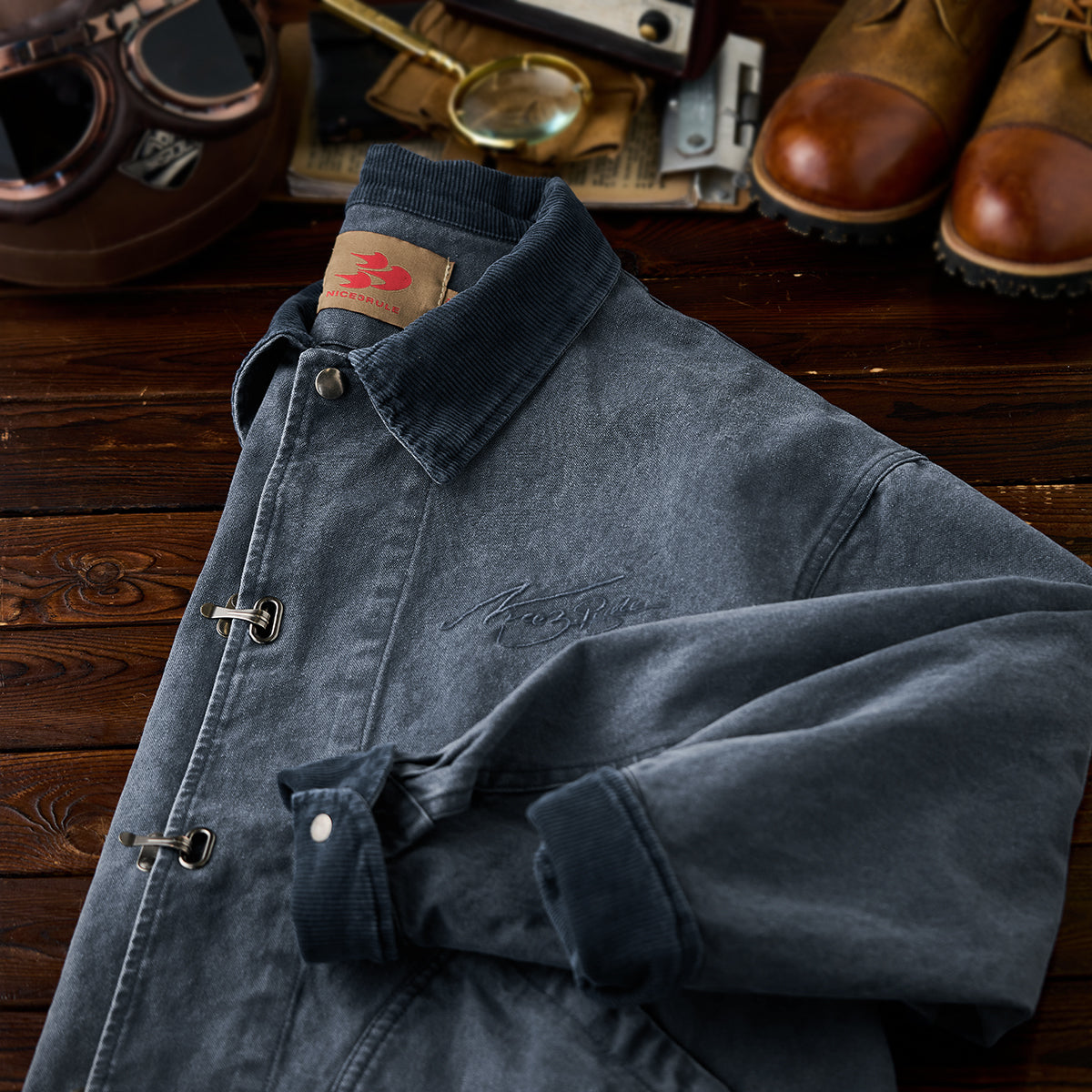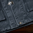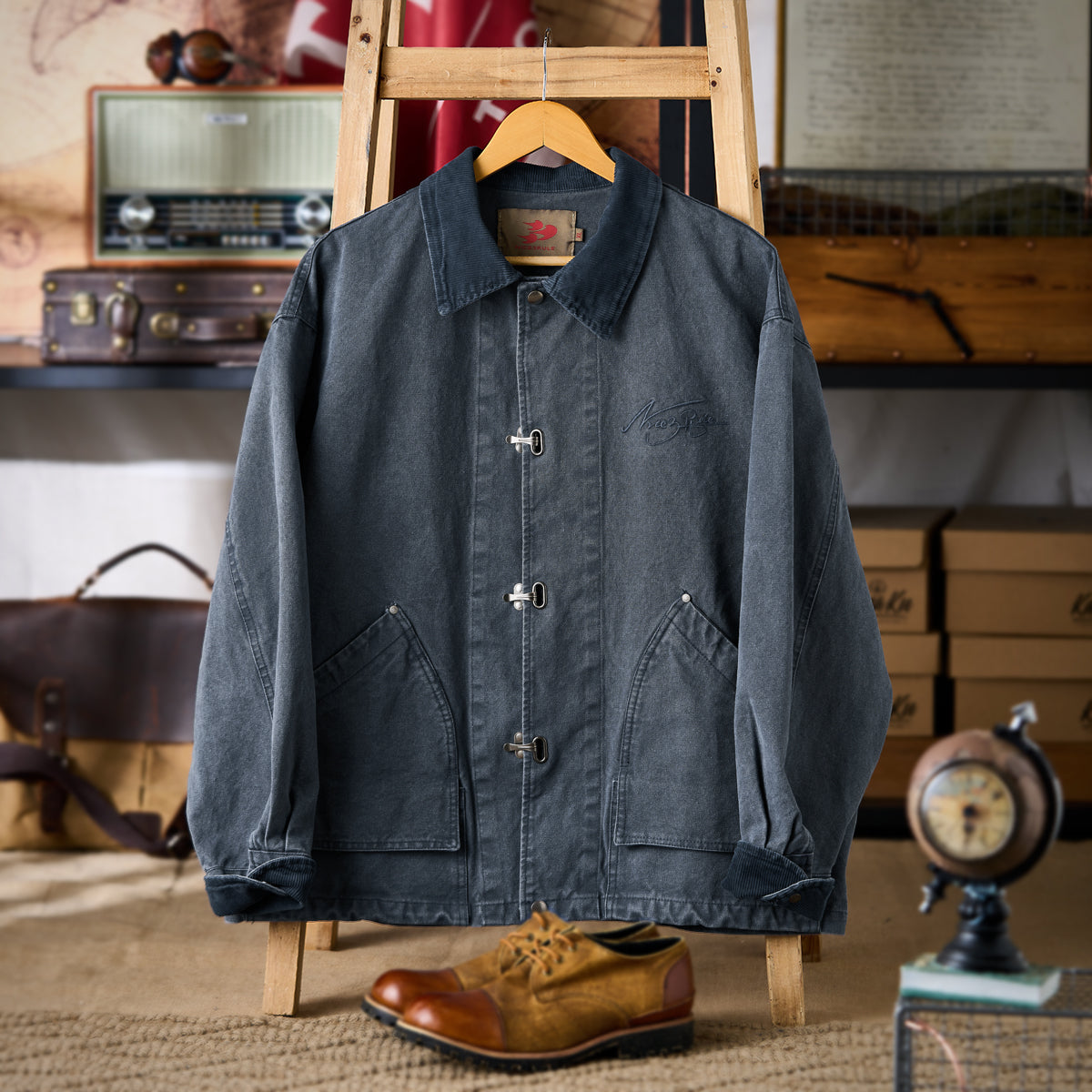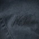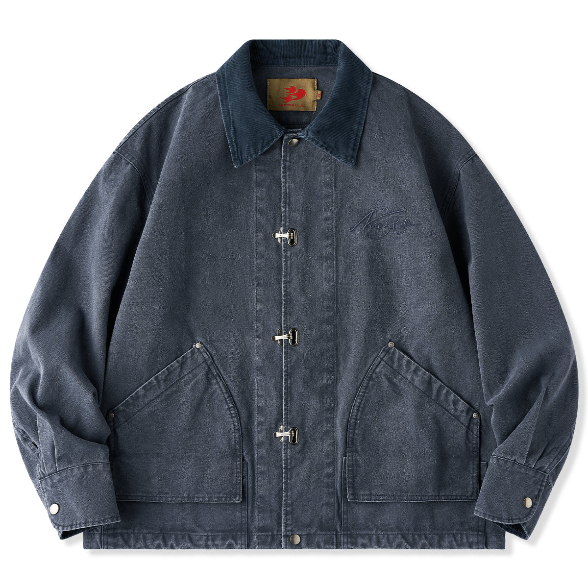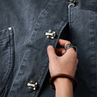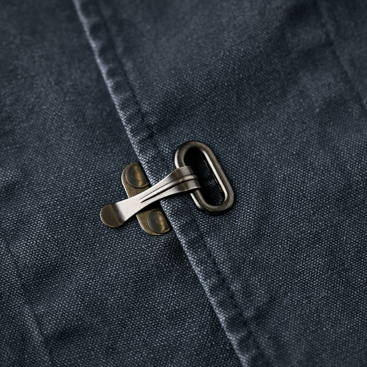 胸元の刺繍は、同系色でさりげなく配置されており、主張しすぎず洗練された印象を与えます。斜めのパッチポケットは、手を自然に入れやすい角度で配置され、実用性が高いです。フックボタンは通常のジッパーやスナップボタンと異なり、クラシックでユニークな雰囲気を醸し出します。