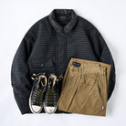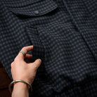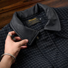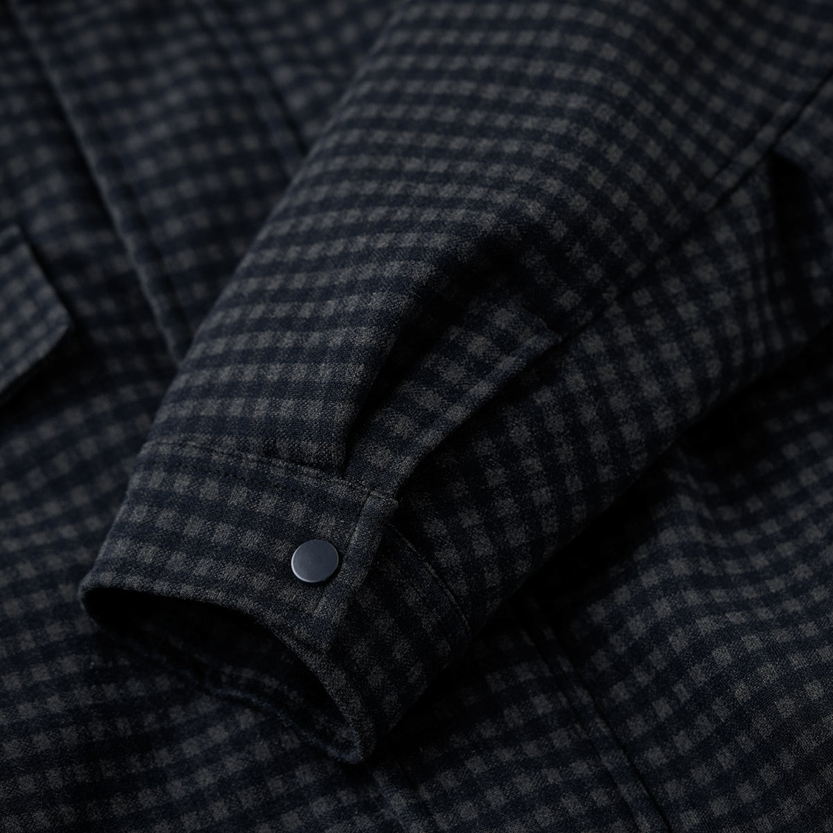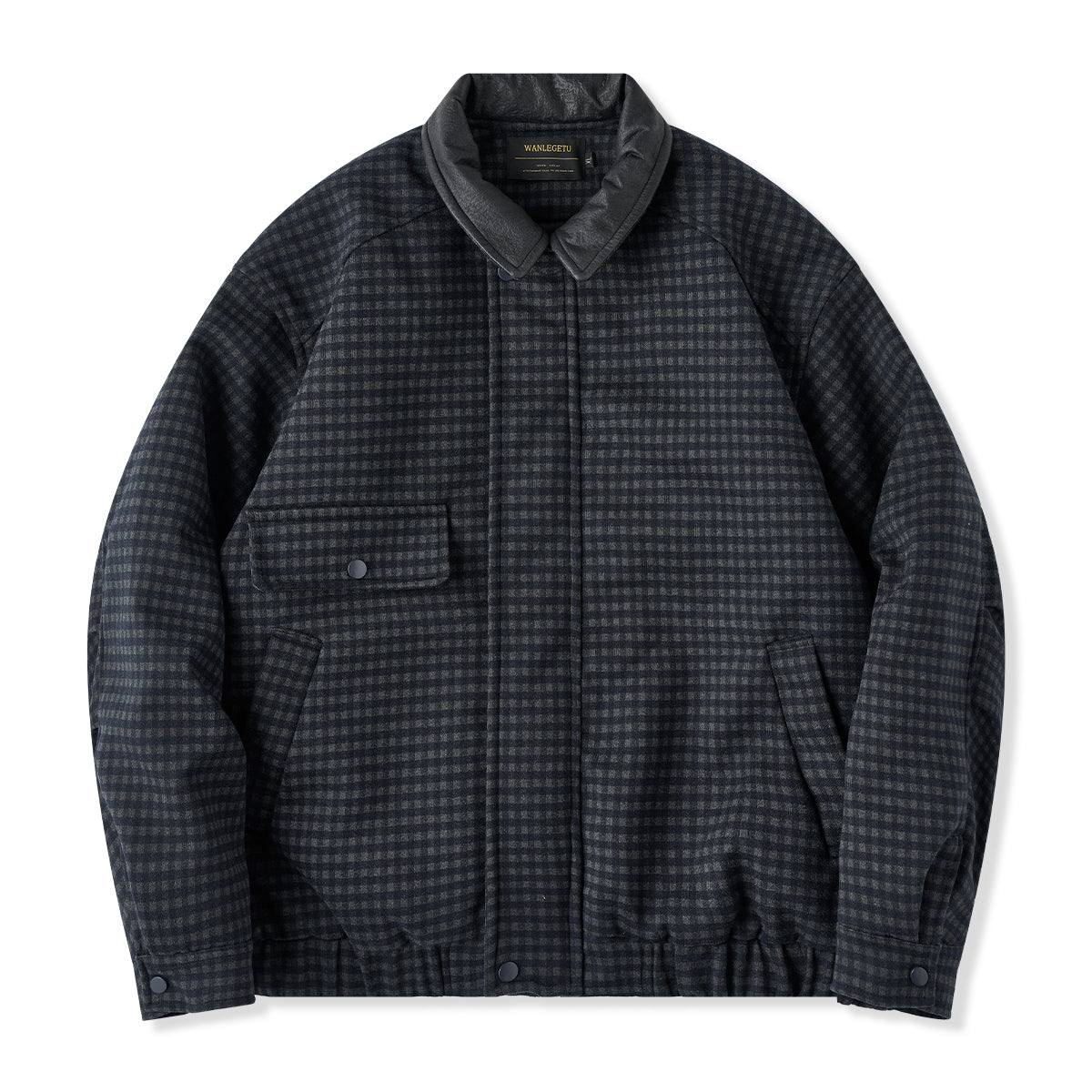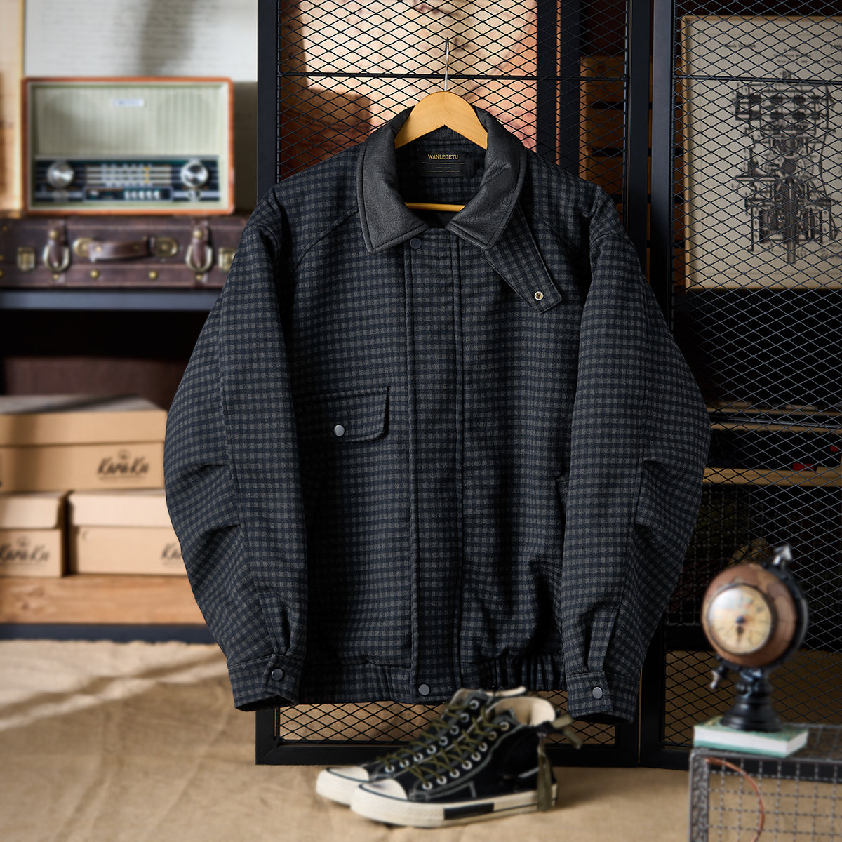 チェック柄がクラシカルな印象を与えつつ、レザー襟やチンストラップが男らしいアクセントに。程よくゆとりのあるシルエットで、冬のカジュアルスタイルに最適な一着です。