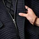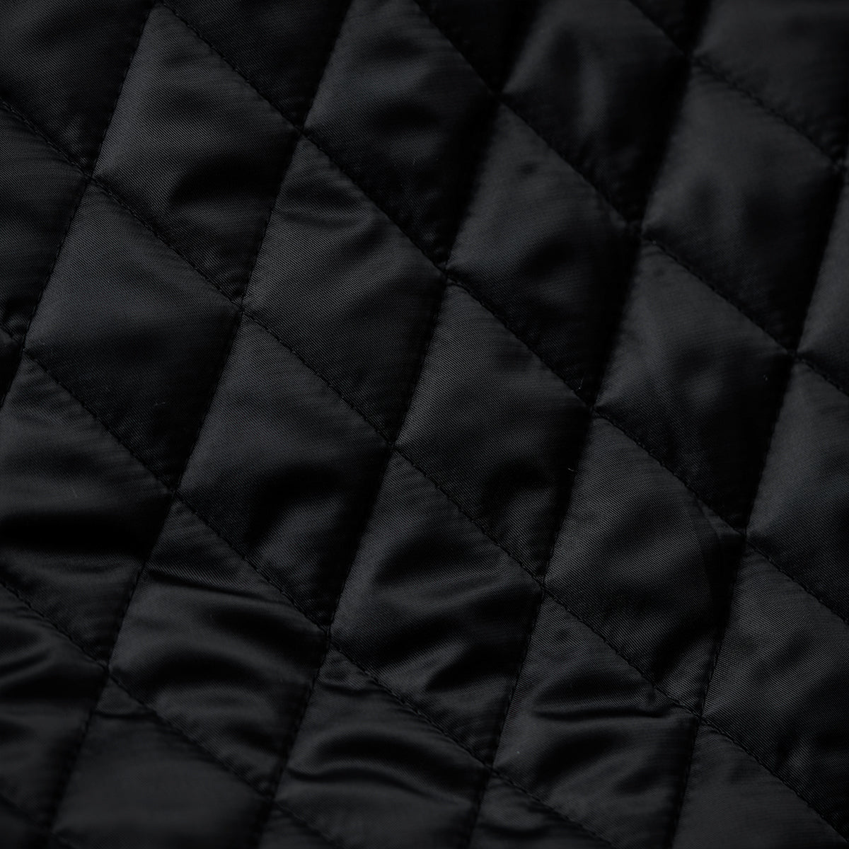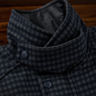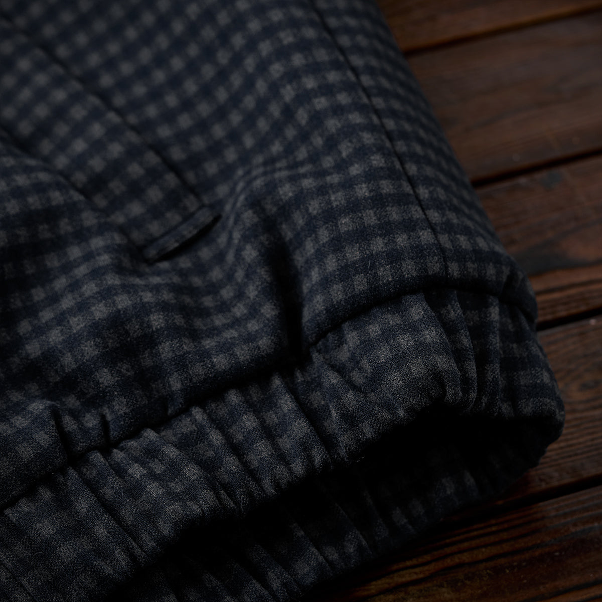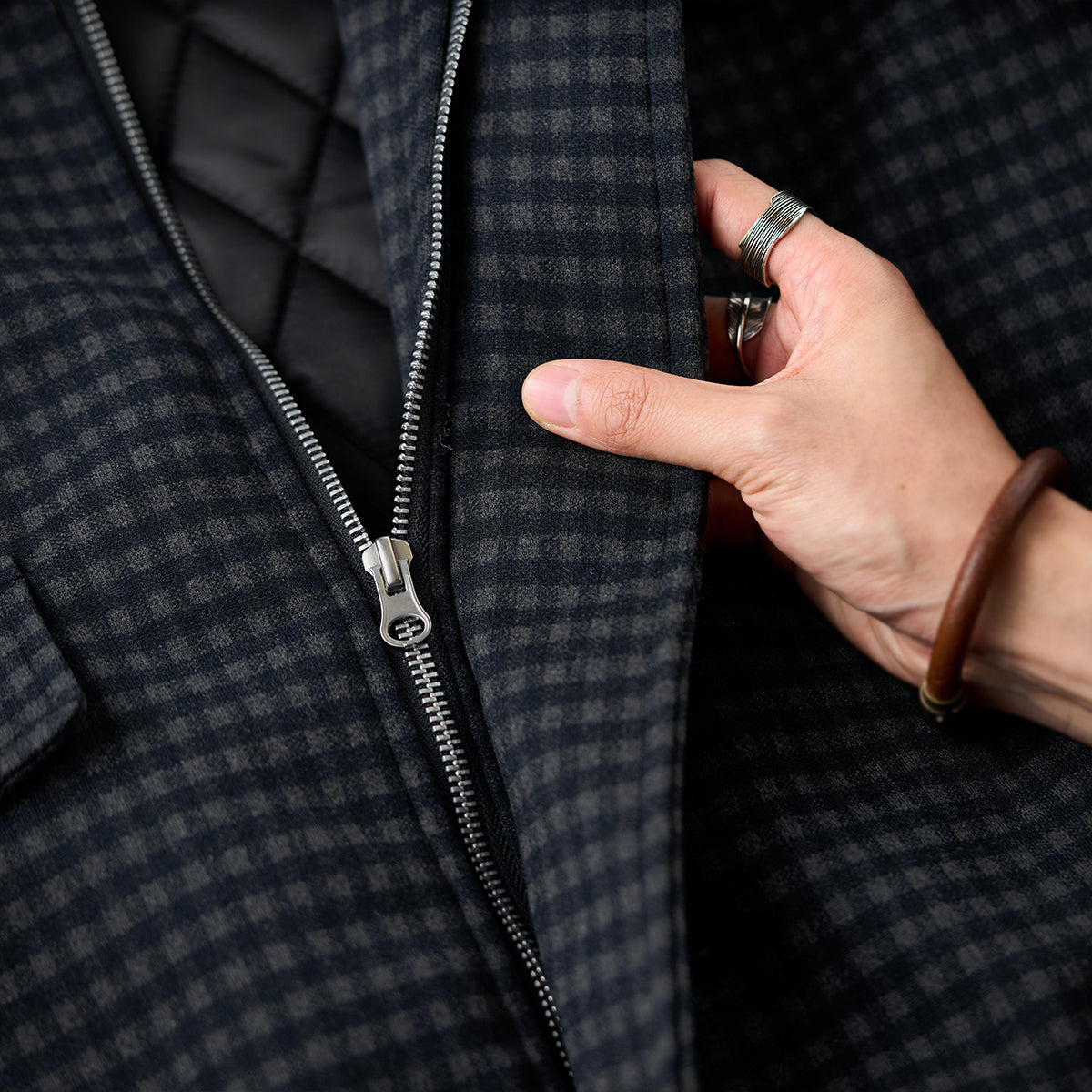 レザー襟とチンストラップをあしらった、機能性とデザイン性を兼ね備えたチェック柄裏キルト中綿ジャケット。裏地にはキルティング中綿を採用し、保温性と軽さを両立。