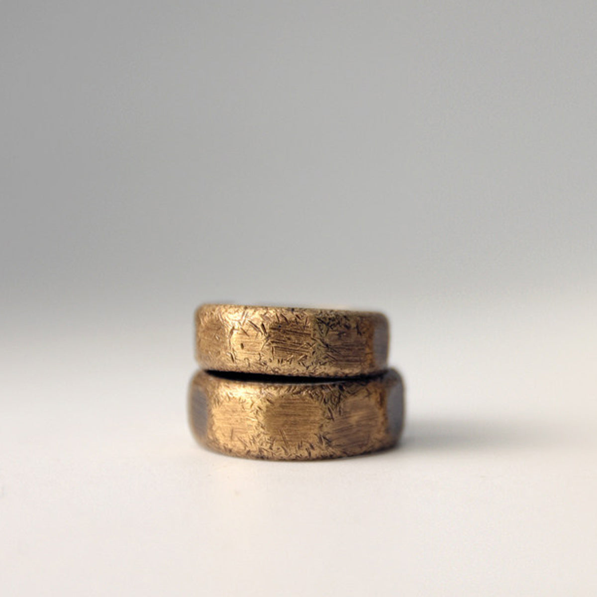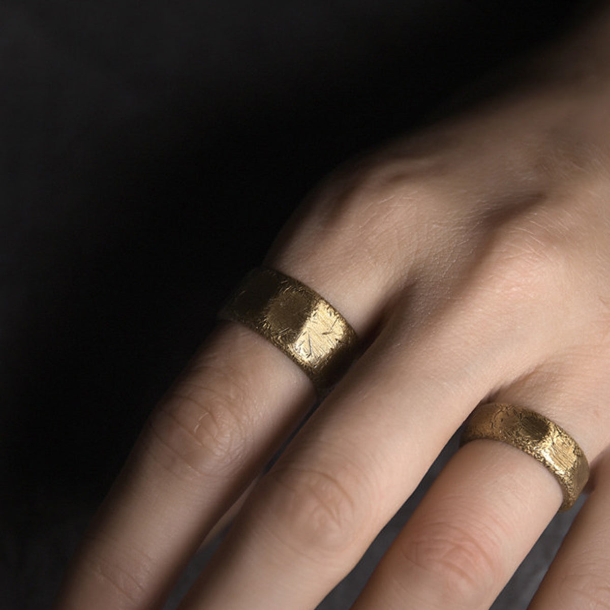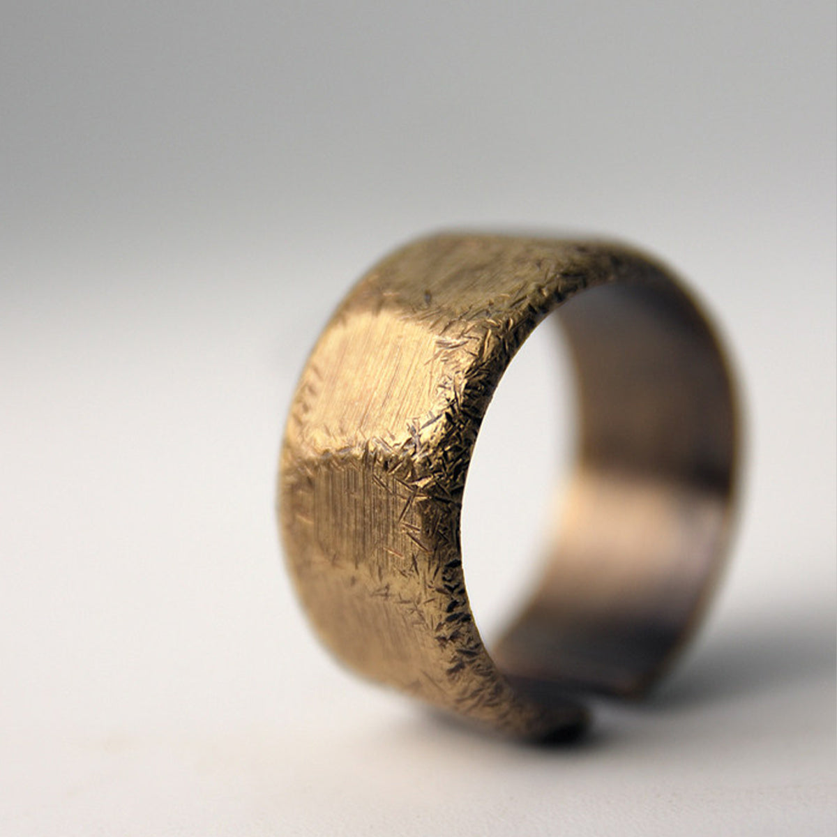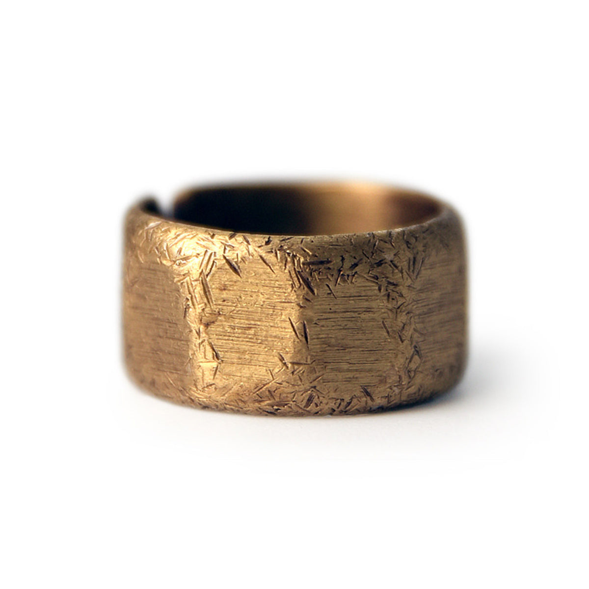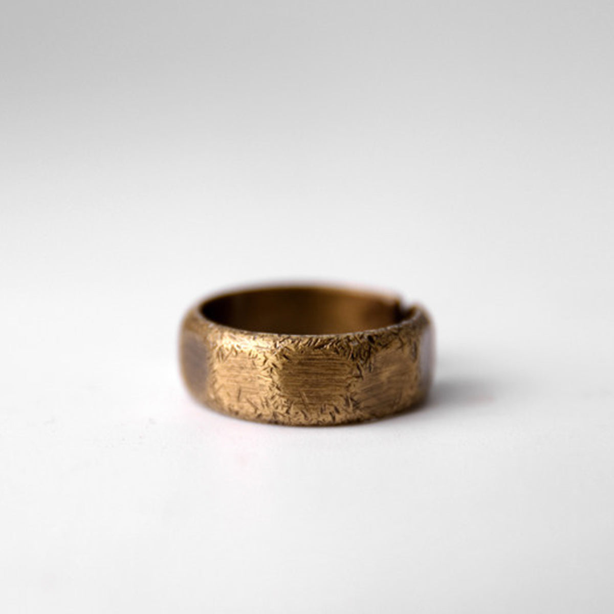 真鍮を使用したリングで、温かみのあるゴールドトーンが特徴です。表面にはランダムなテクスチャが施されていて、手作業で仕上げられたような独特の風合いを持っています。
