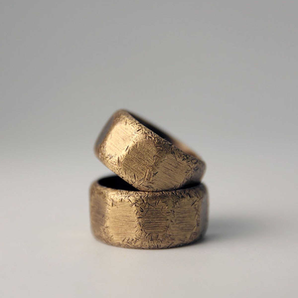 リング全体が多面体のような形状を持ち、規則的ではない面の配置が手作りの独自性を表現しています。幅は適度に広く、存在感がありながらも過剰な主張をしないバランスがとれています。