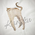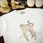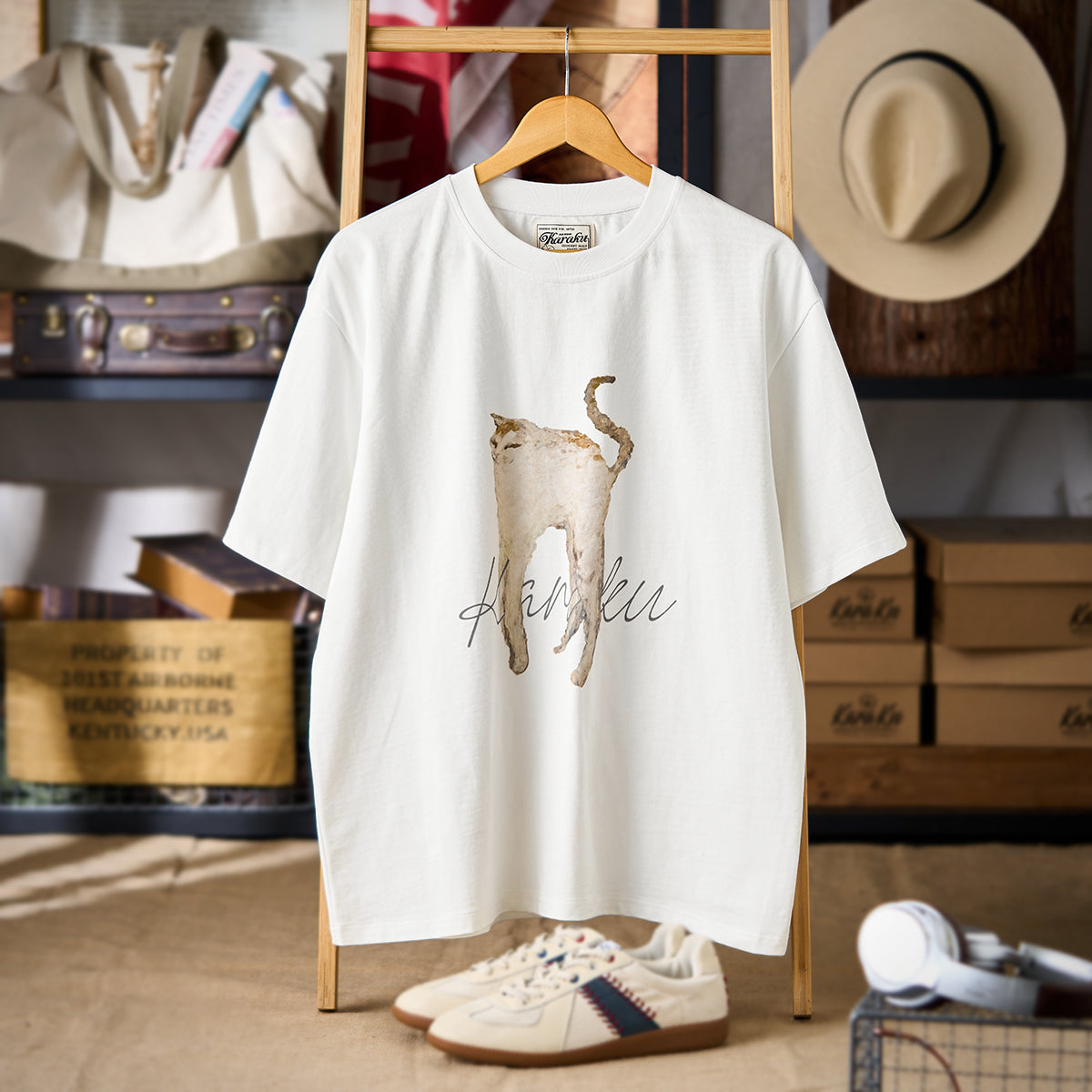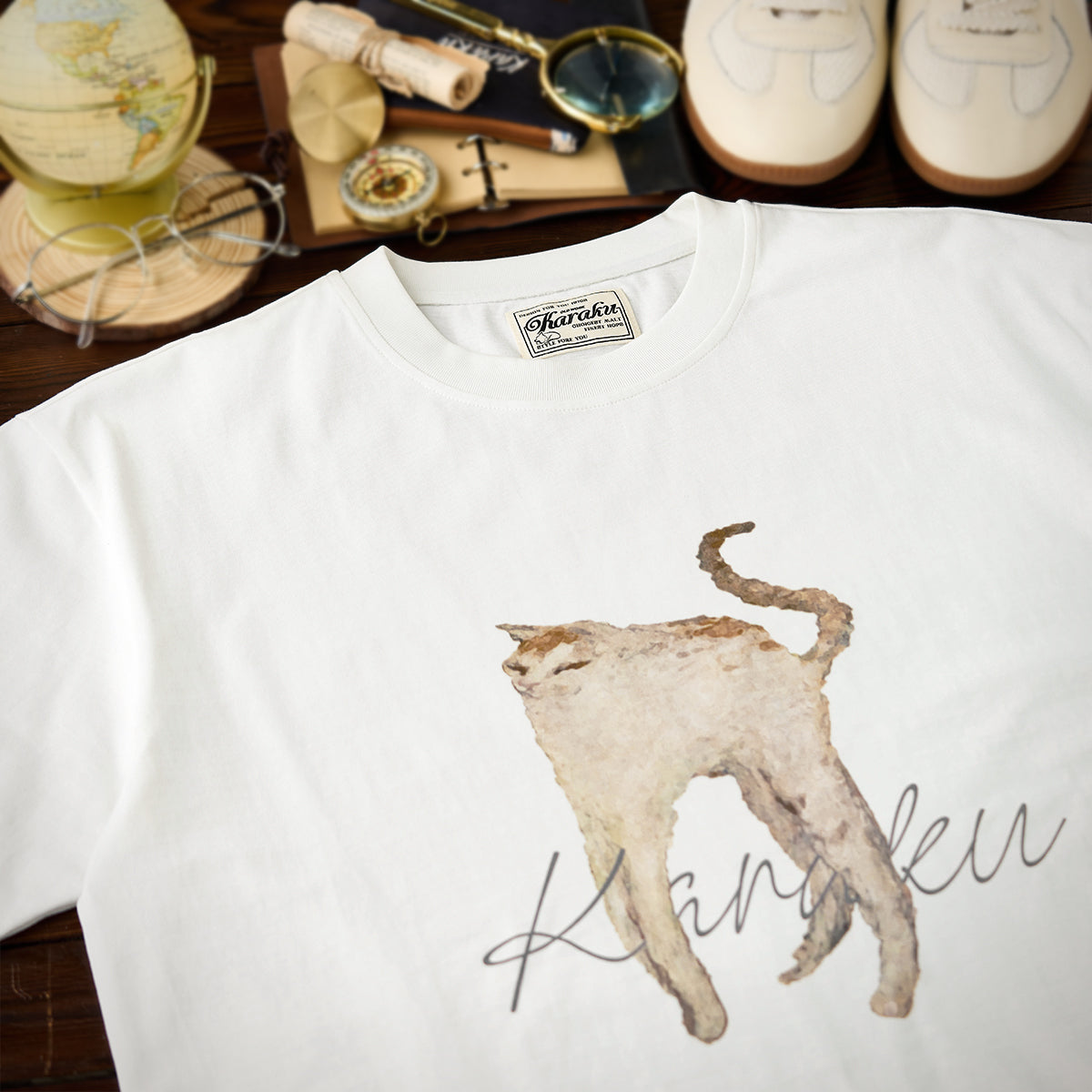 猫の姿に焦点を当てている点がユニークで、一般的な描写とは異なり、ミステリアスでアート性が高いです。猫の姿は写実的でありながら、あえて細部を曖昧に描くことで、デザイン全体が柔らかい印象に仕上がっています。ミニマルな白地にこの絵を配置することで、作品そのものの美しさが際立っています。