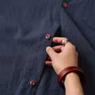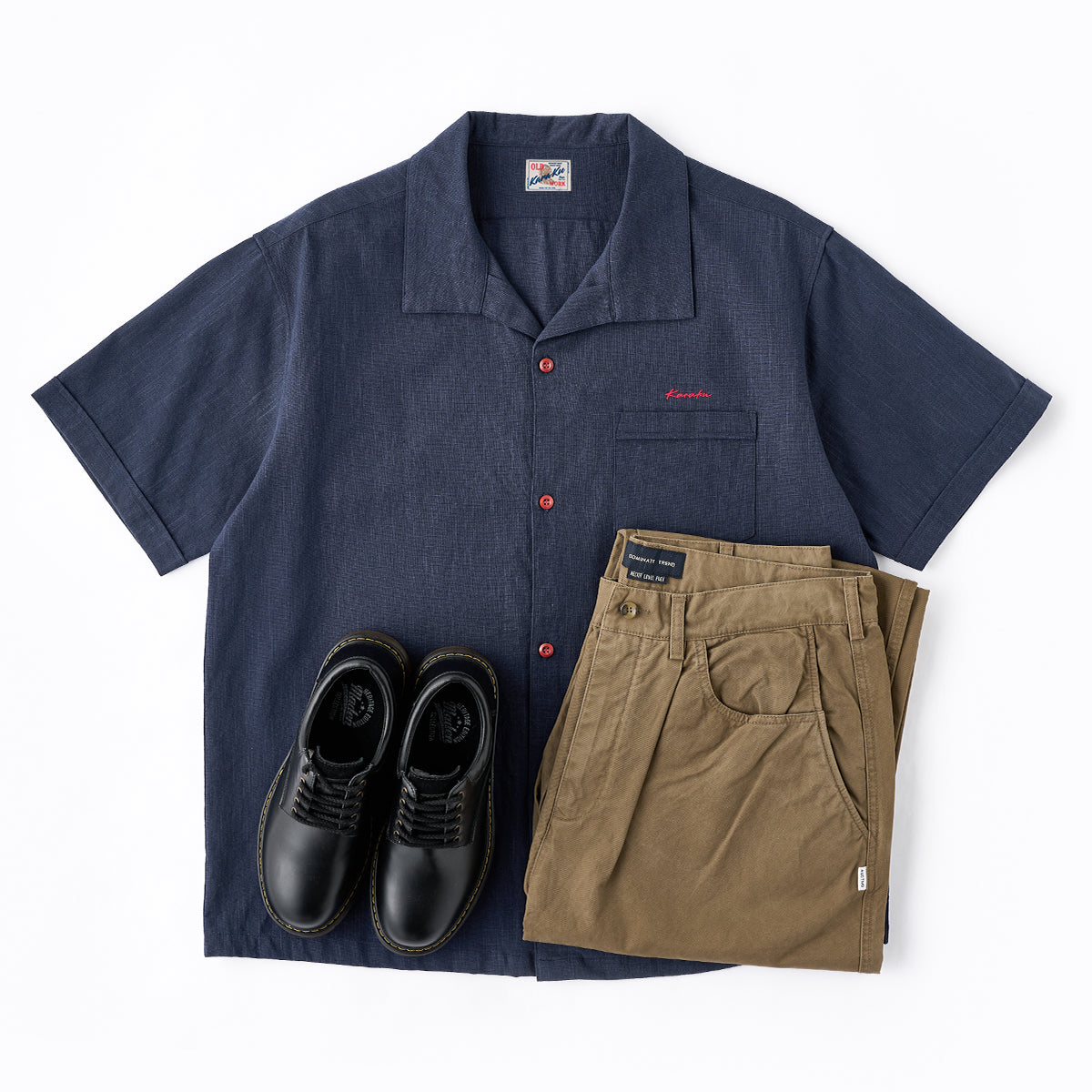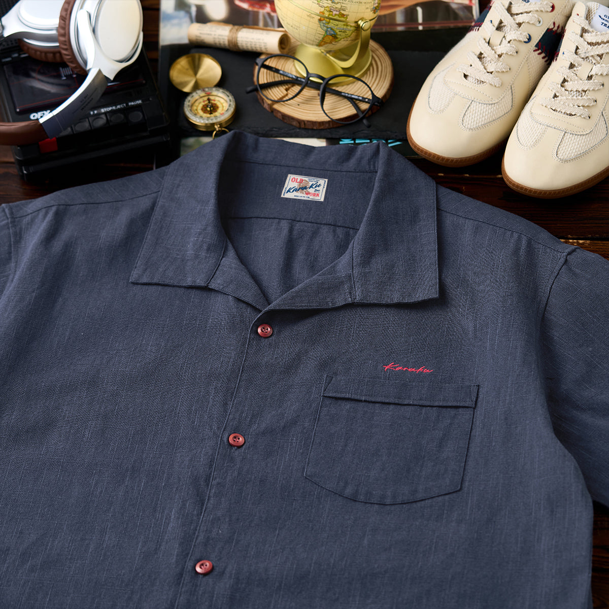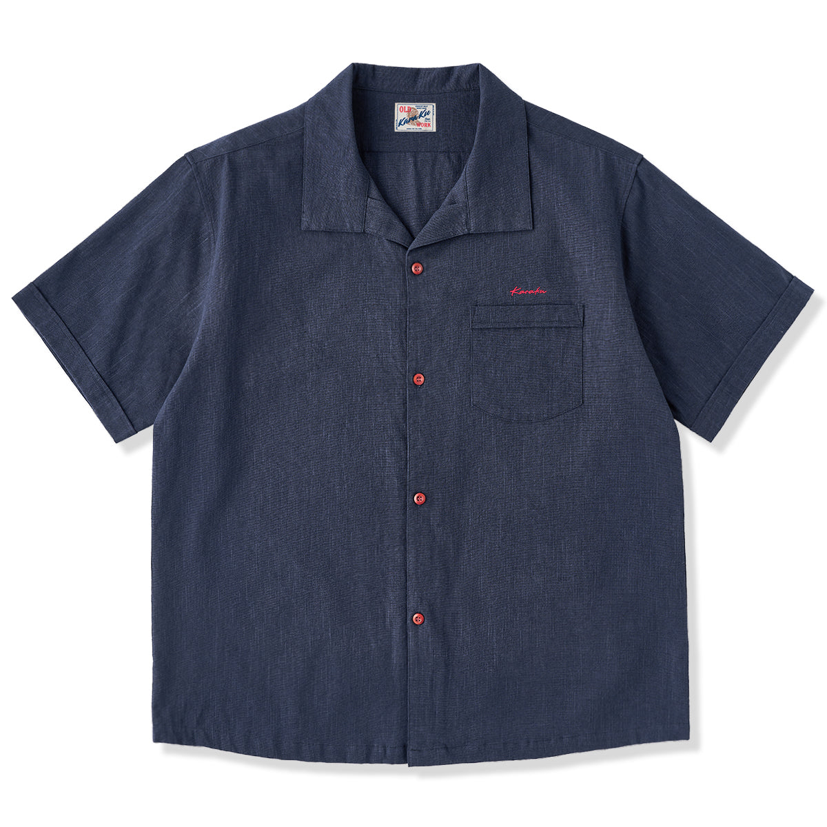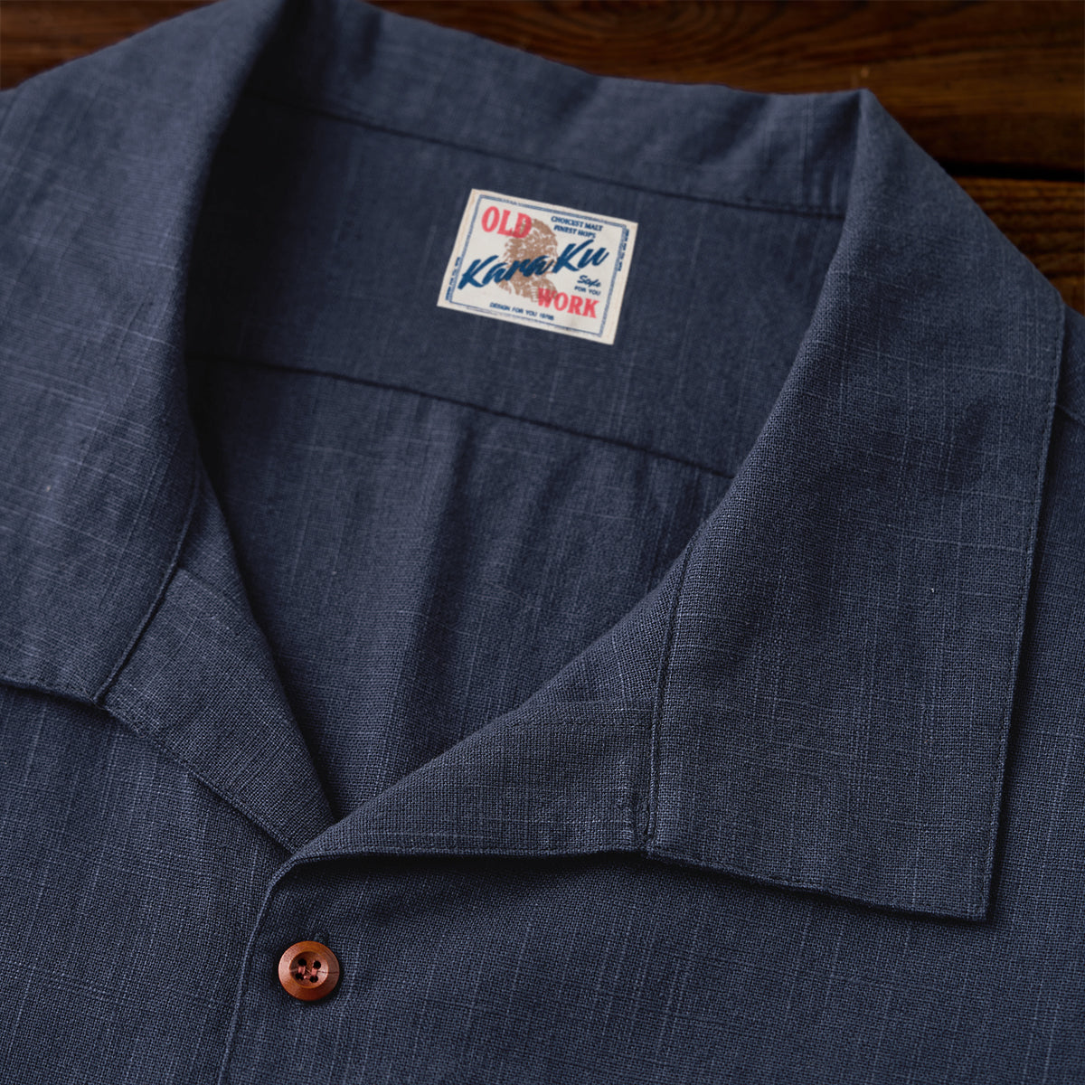 オープンカラーはリラックスした雰囲気を持ち、カジュアルなスタイルに最適です。シンプルなスクエア型の胸ポケットが1つ配置されています。ポケット上に赤い「KaraKu」刺繍のロゴがアクセントとなり、シンプルなデザインにさりげない個性をプラスしています。ウッド調のナチュラルなボタンが使用されており、シャツ全体のリラックスした雰囲気を強調しています。