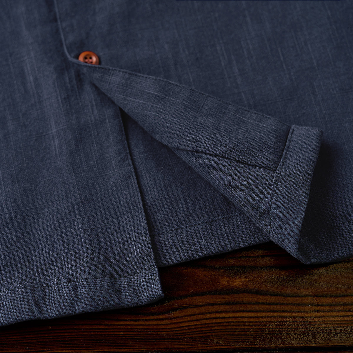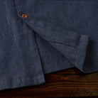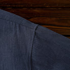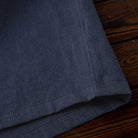 リネン素材は通気性がよく、軽量で柔らかい特徴があります。藍染めを施したことで、独特の深い青色と風合いが生まれています。自然素材の質感がありつつ、涼しげな印象を与えます。
