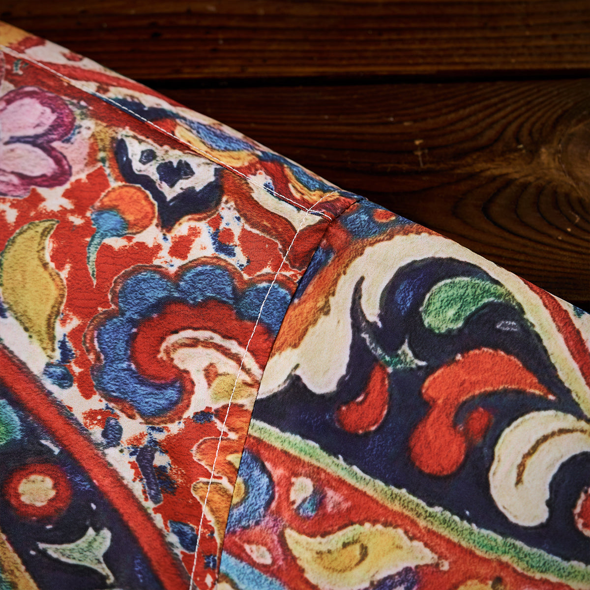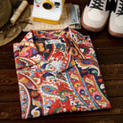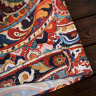 手書き風の油絵タッチが特徴のペイズリー柄で構成されており、ヴィンテージ感とアート性を兼ね備えた華やかなデザインが目を引きます。ペイズリー特有のしずく型の模様を基礎に、花や植物をイメージさせるモチーフが豊富に配され、エキゾチックかつ生命力を感じます。