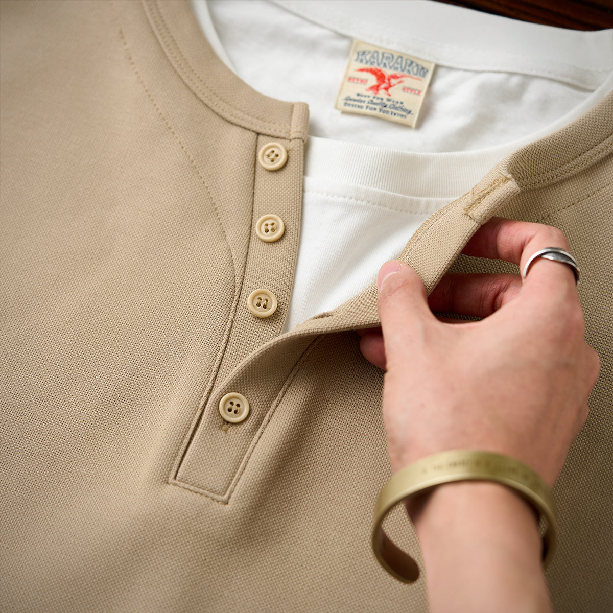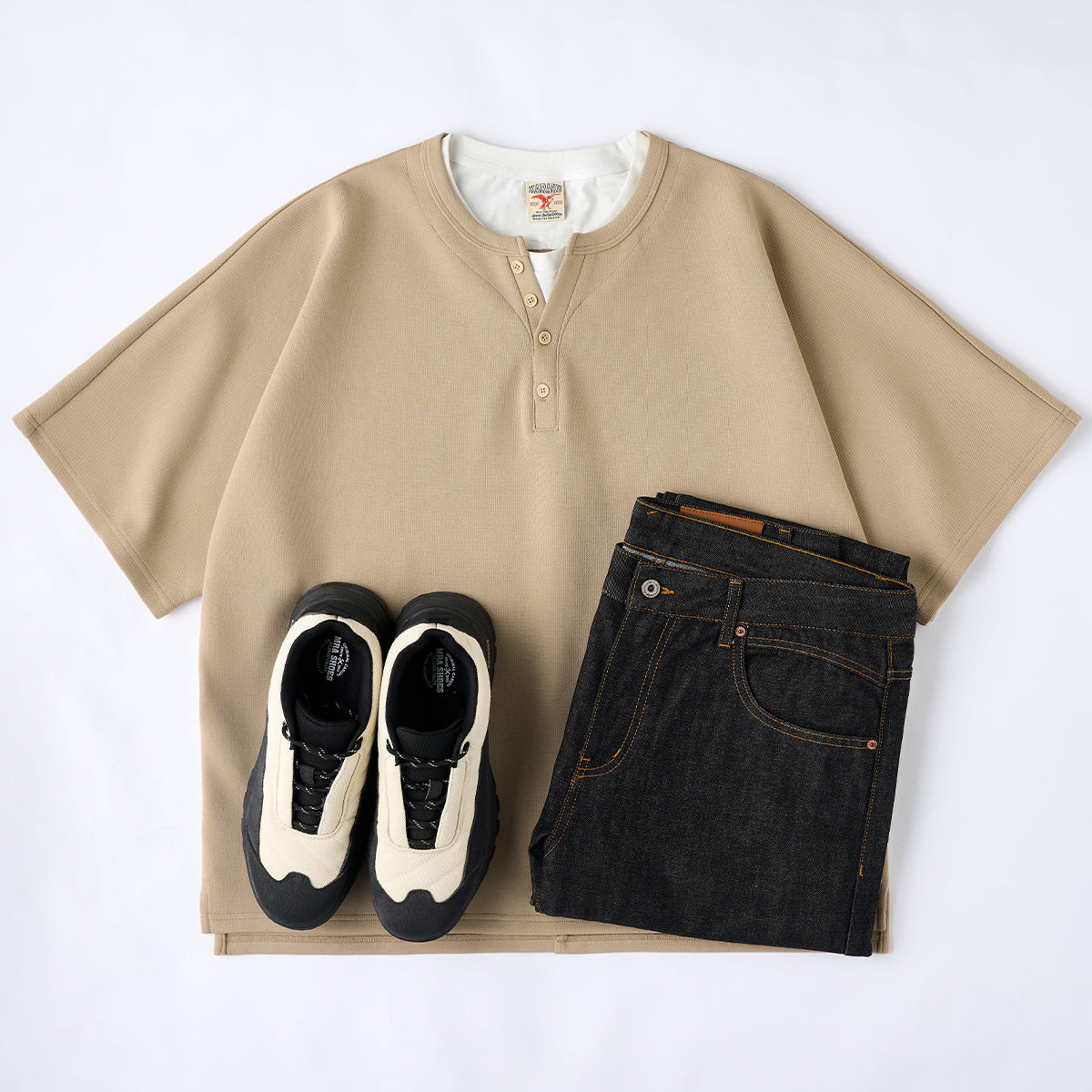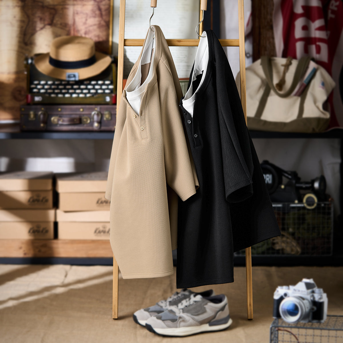 ヘンリーネックデザインは、シンプルなTシャツにアクセントを加えるディテールです。裾のスリットやステッチワークなど、細部の作り込みも丁寧で、デザイン性と実用性を両立しています。