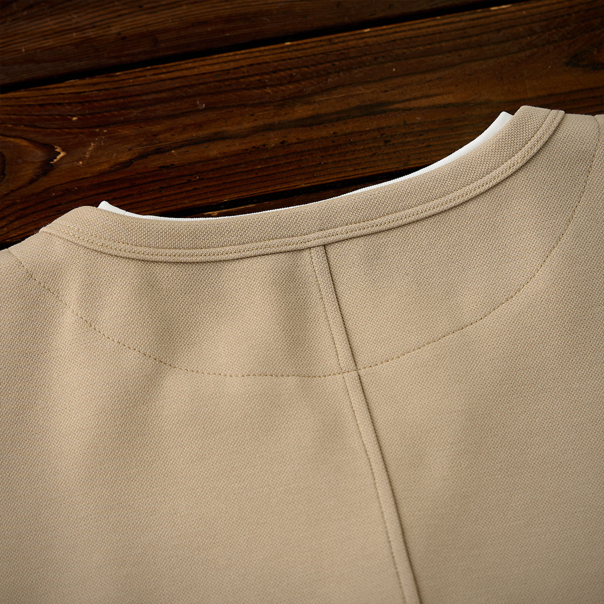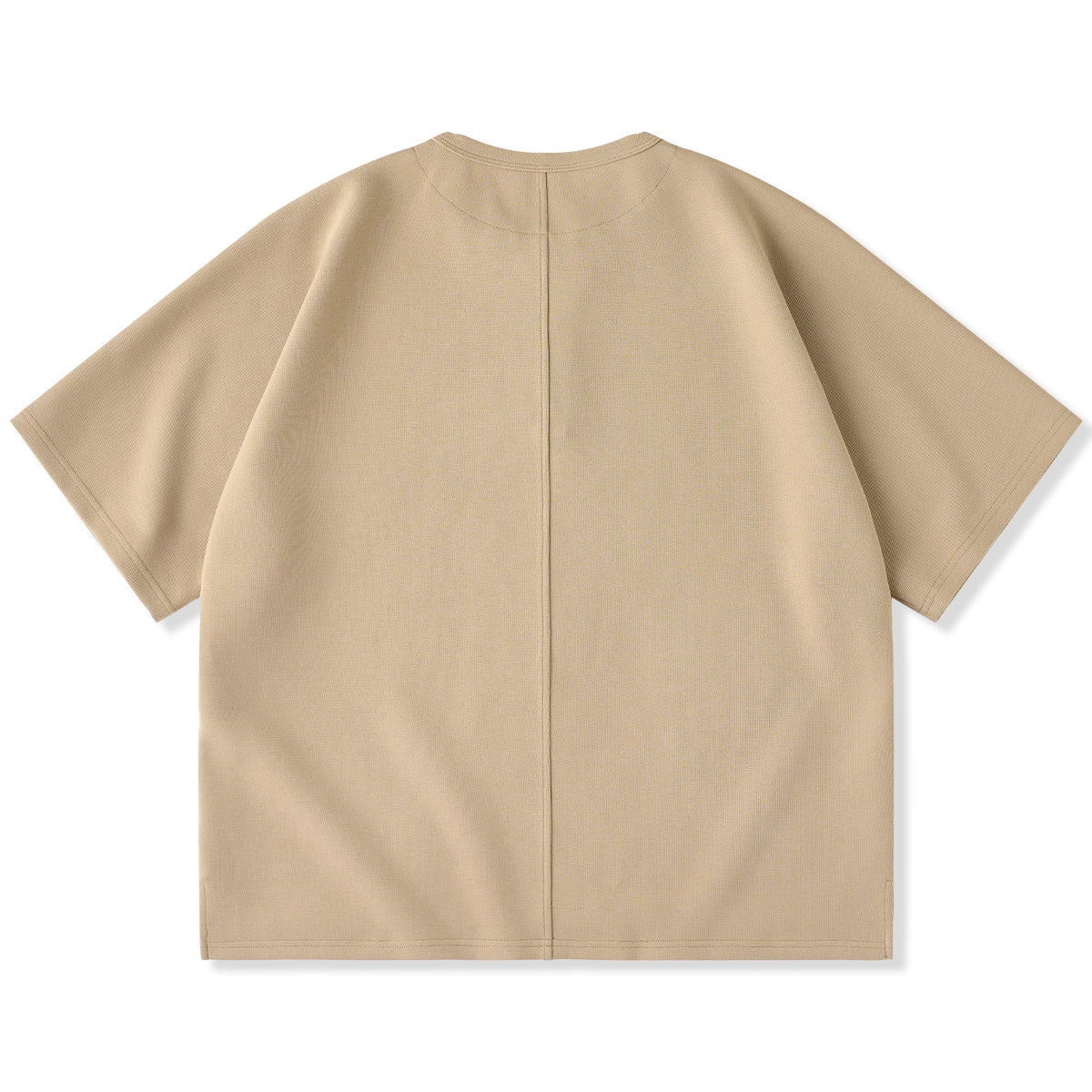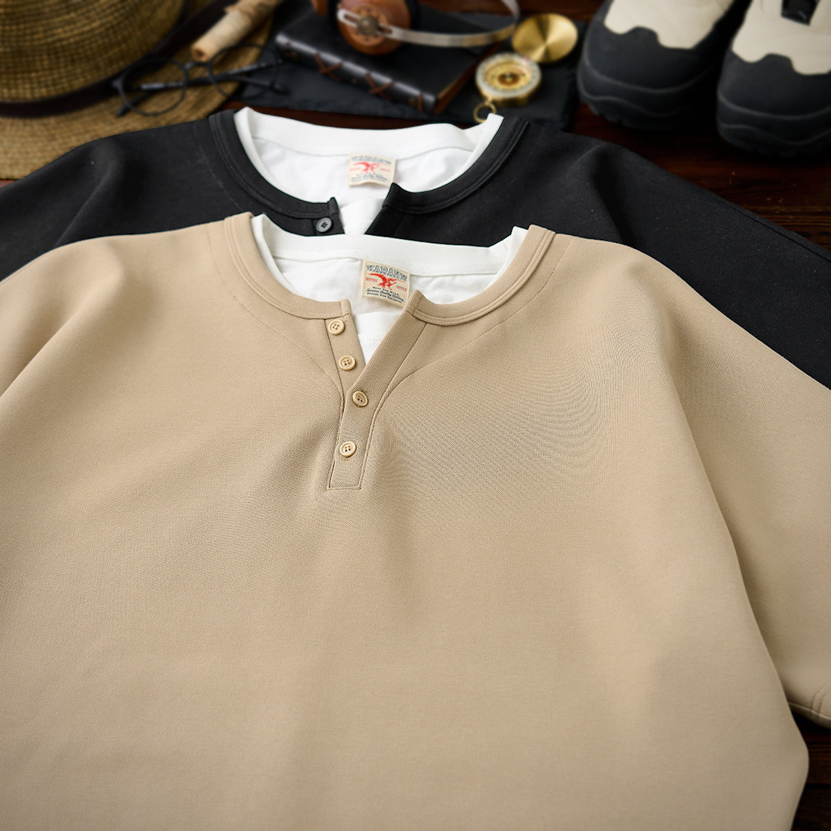 ヘンリーネックデザインは、シンプルなTシャツにアクセントを加えるディテールです。裾のスリットやステッチワークなど、細部の作り込みも丁寧で、デザイン性と実用性を両立しています。