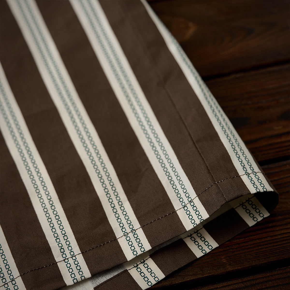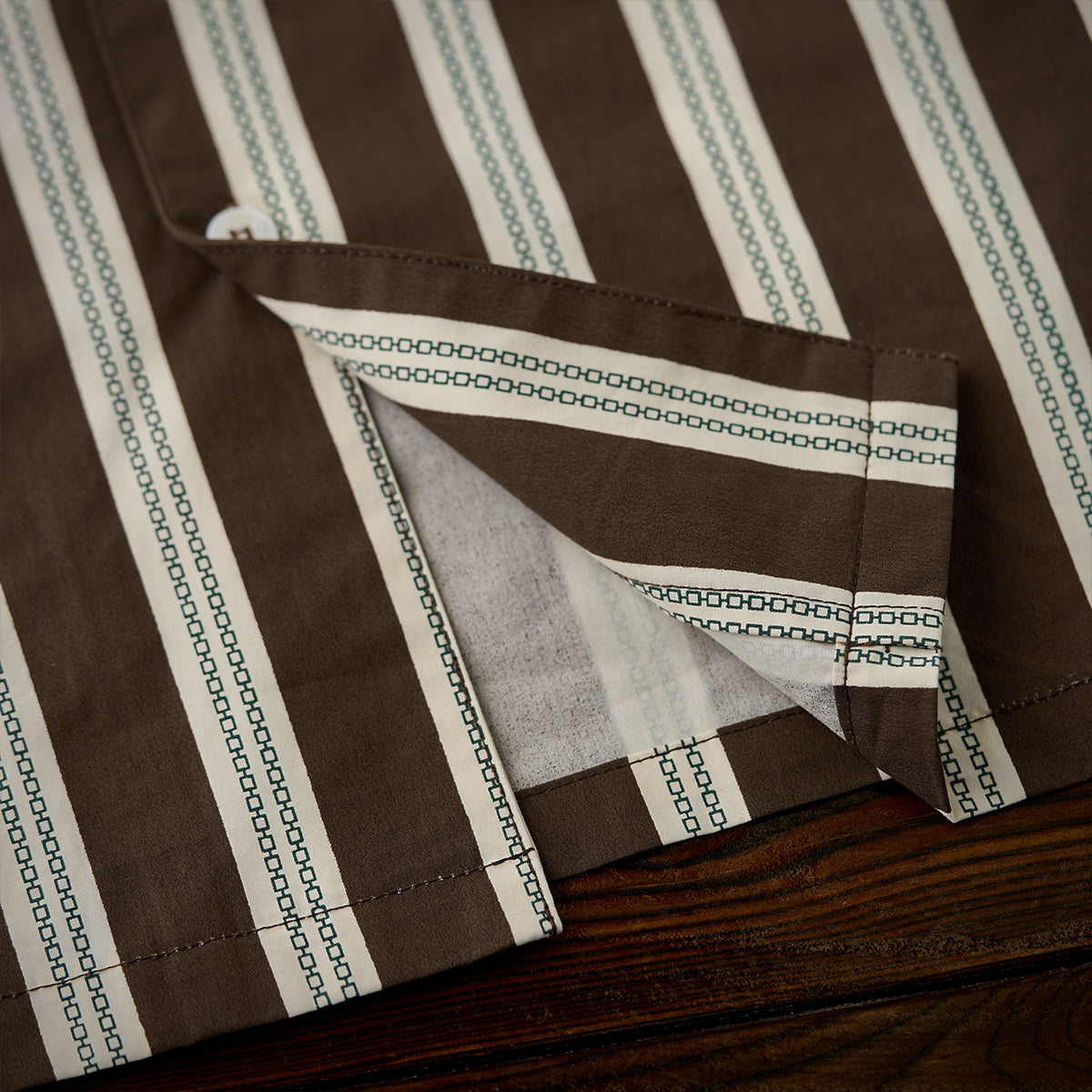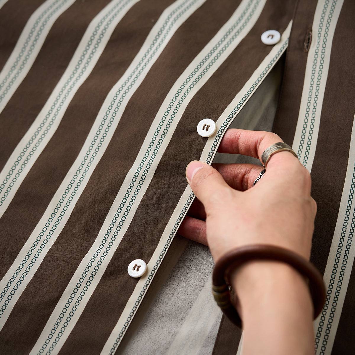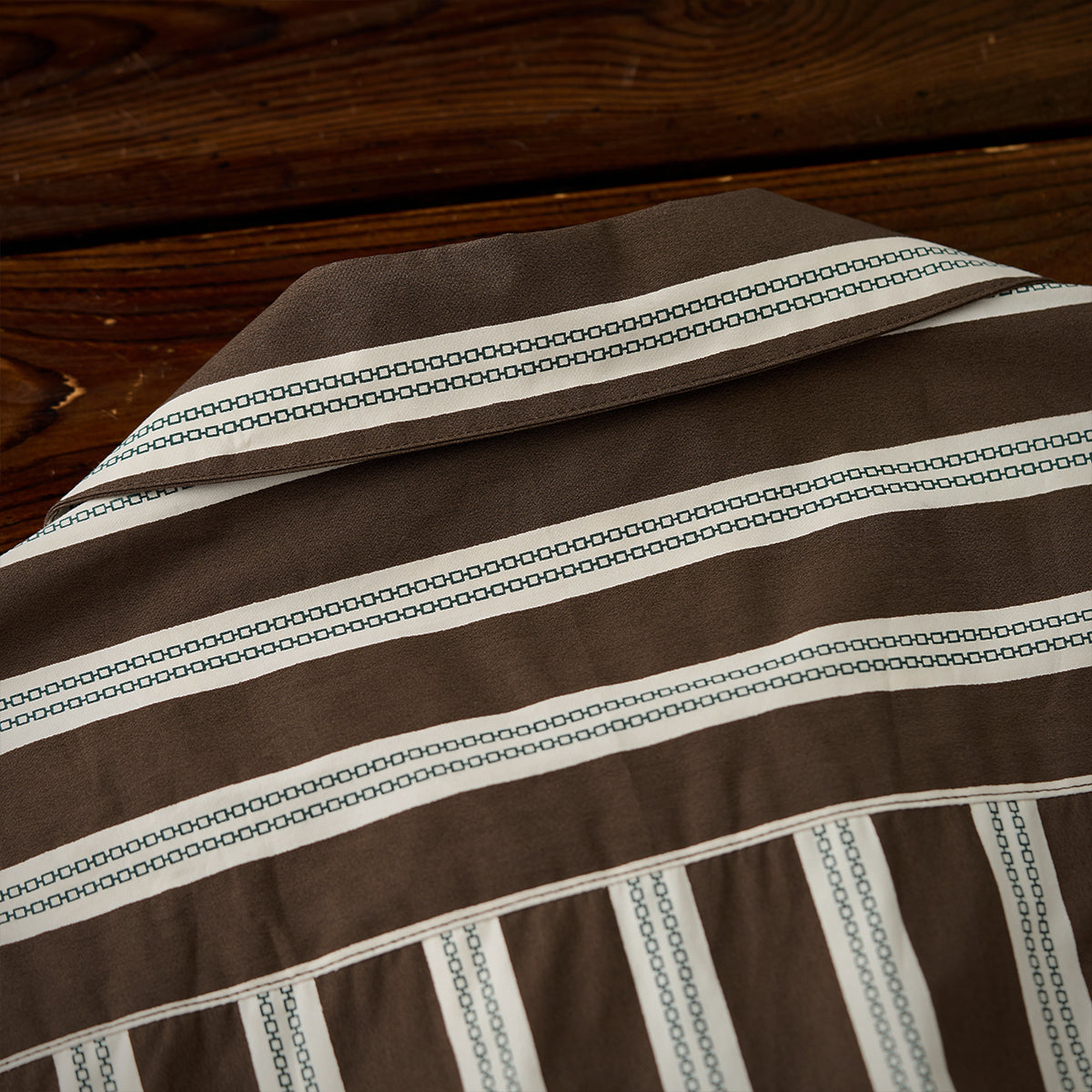 コーヒーを基調としたストライプ柄で、細かなグリーンのチェーン模様がアクセントになっています。この配色はヴィンテージ感を強調しつつも、落ち着いた雰囲気を醸し出しています。