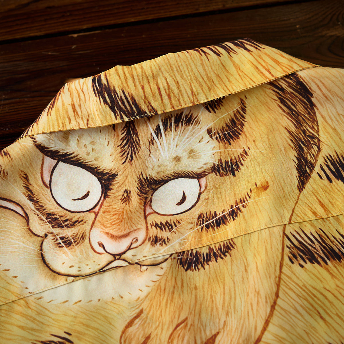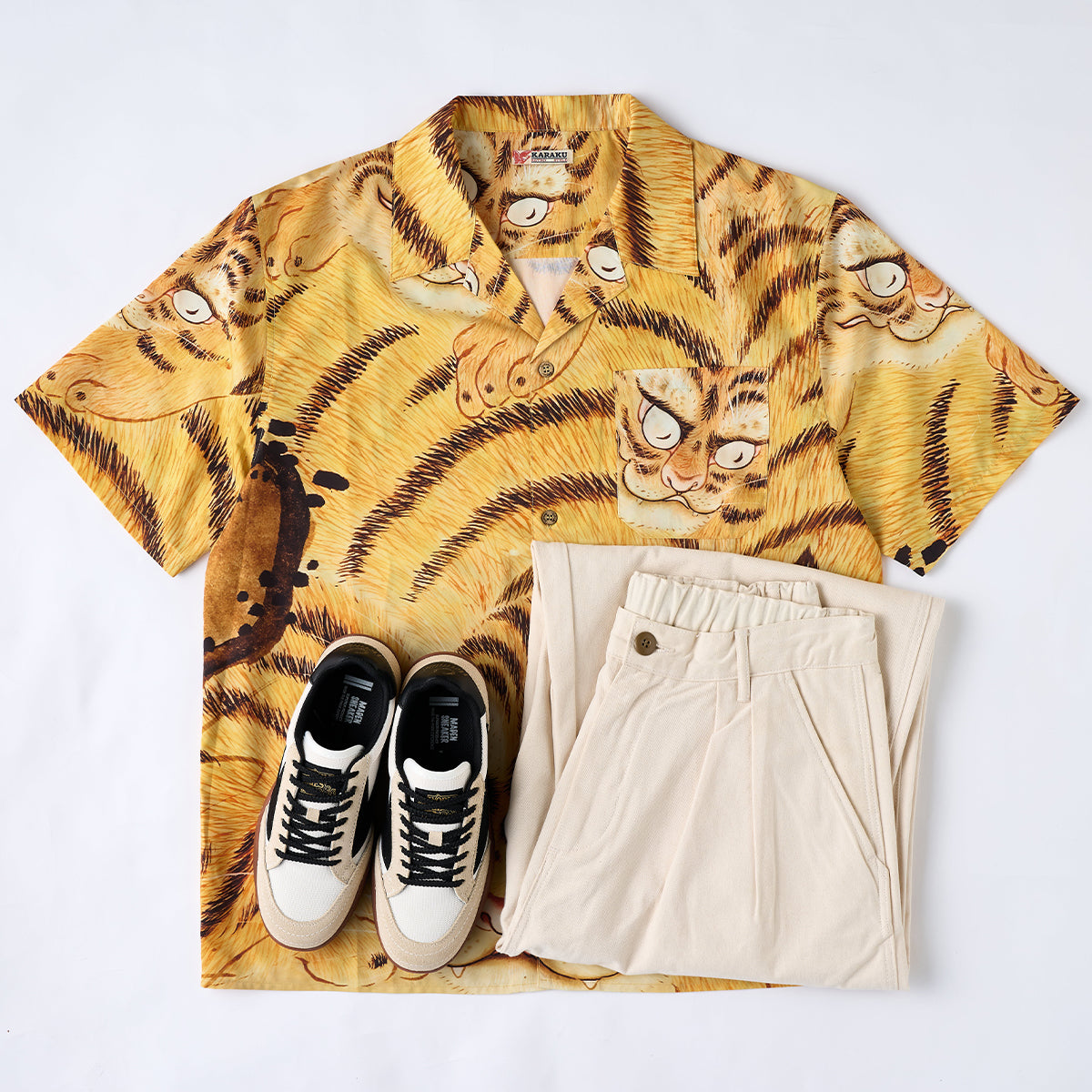 江戸時代、異国文化の玄関口として栄えた長崎。その地で独自の発展を遂げた長崎派の絵画様式をモチーフに、「虎図」を大胆に総柄プリントで表現した一着です。力強くもどこか愛嬌を感じさせる虎の姿は、当時の絵師たちが中国画の影響を受けながら描いた独特の筆致を再現。躍動感あふれる構図と繊細な線描が、シャツ全体に物語性と迫力を与えます。ベースはリラックス感のあるアロハシャツ仕様。開放的なシルエットと軽やかな着心地で、存在感のある柄を引き立てながらも日常に取り入れやすいバランスに仕上げました。歴史的美意識と現代的感性が交差する、唯一無二のアロハシャツです。