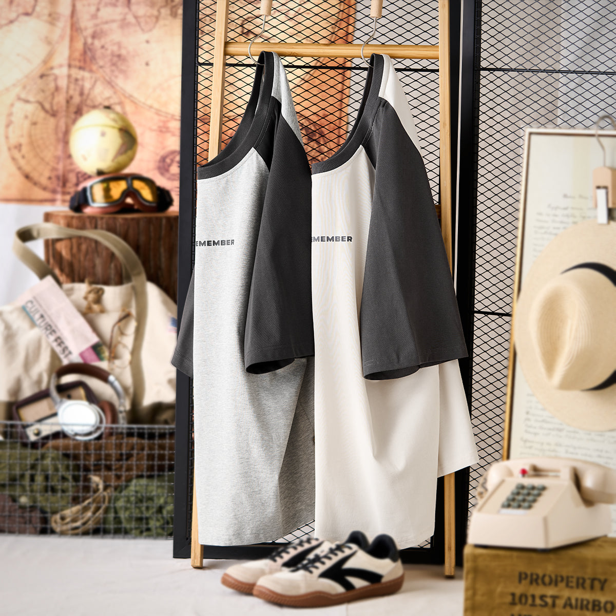 帽子やリュックを追加することで、アウトドアテイストにもアレンジ可能です。