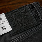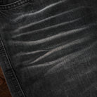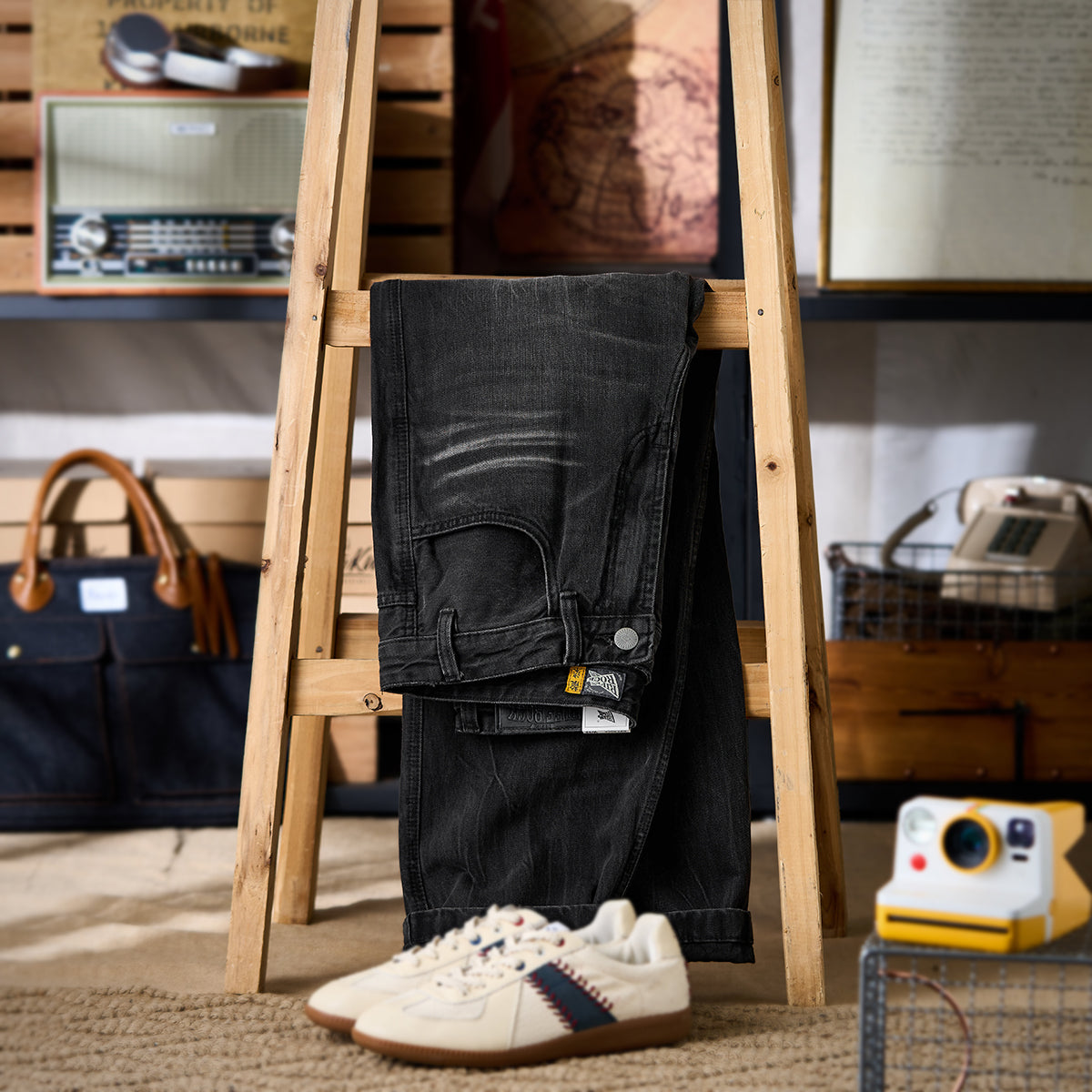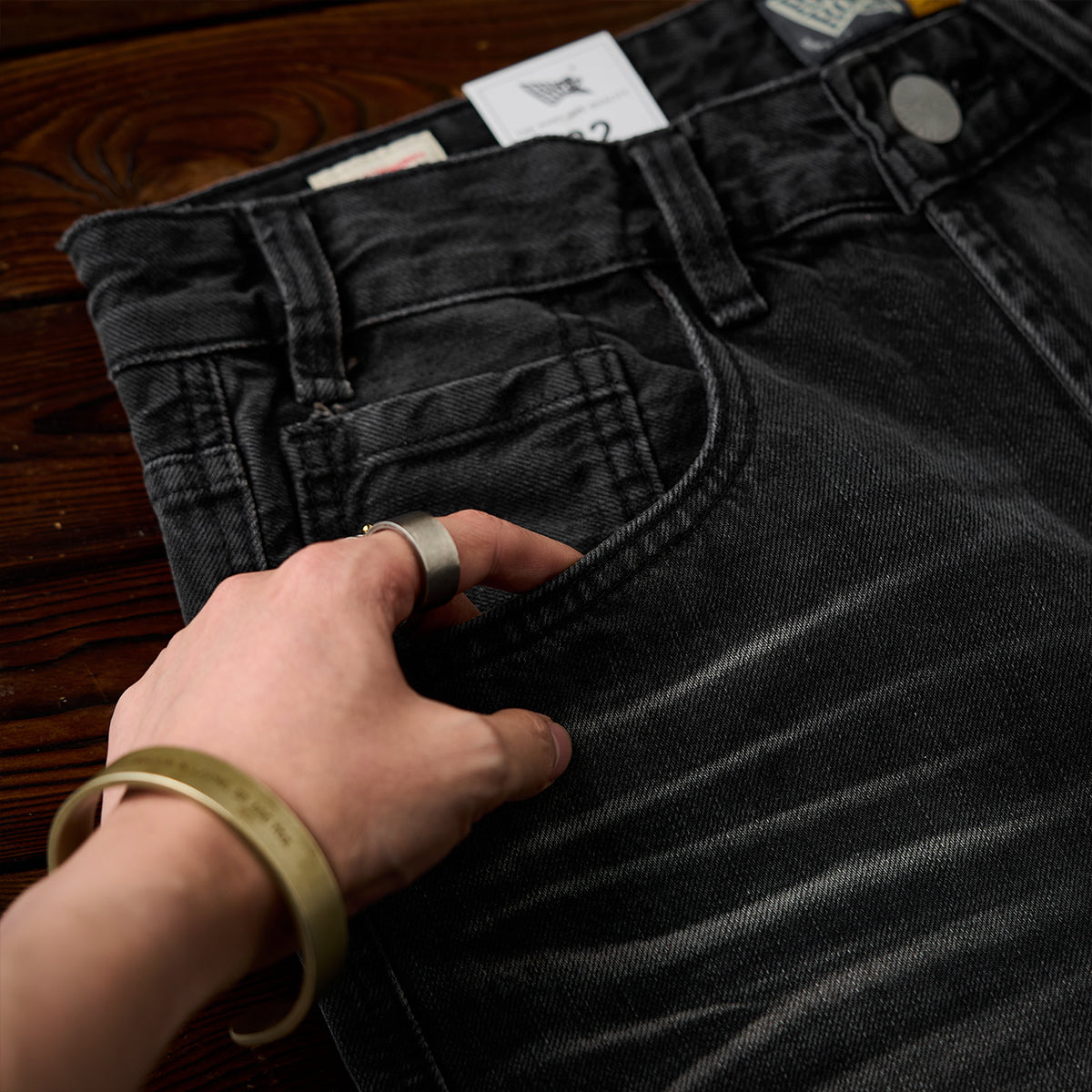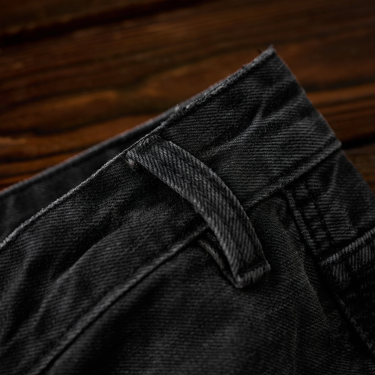 ブラックデニムがベースですが、完全な黒ではなく、ウォッシュ加工による色落ちが所々に見られ、グレイッシュなニュアンスがあります。