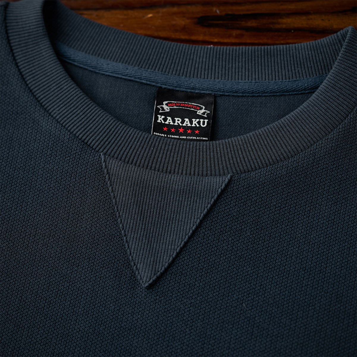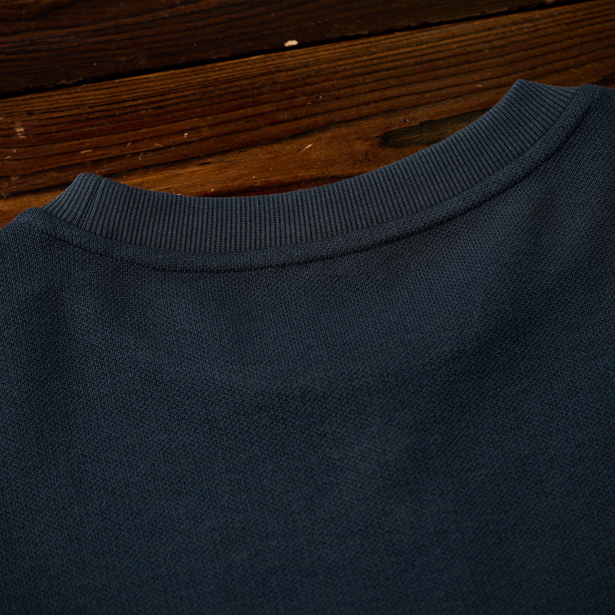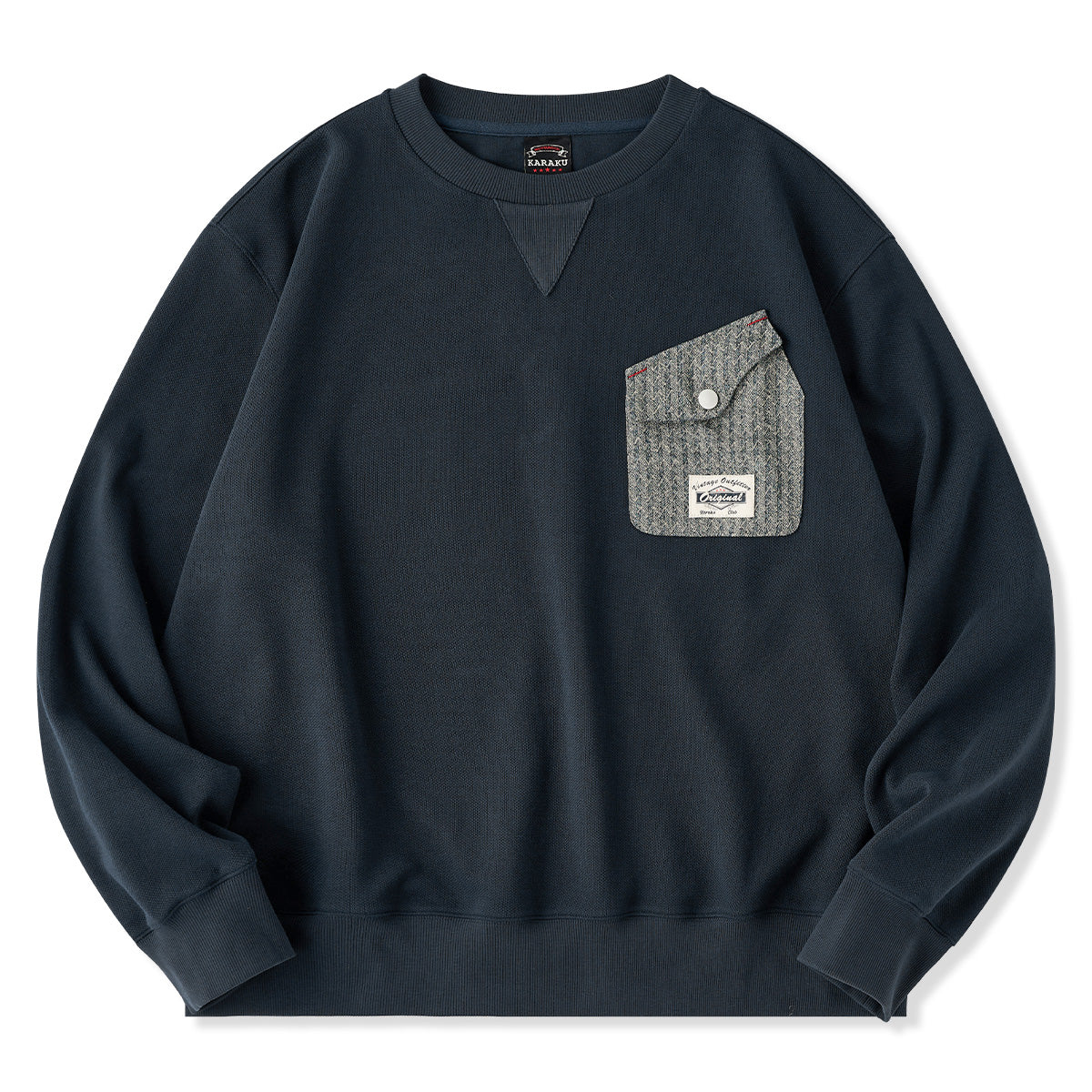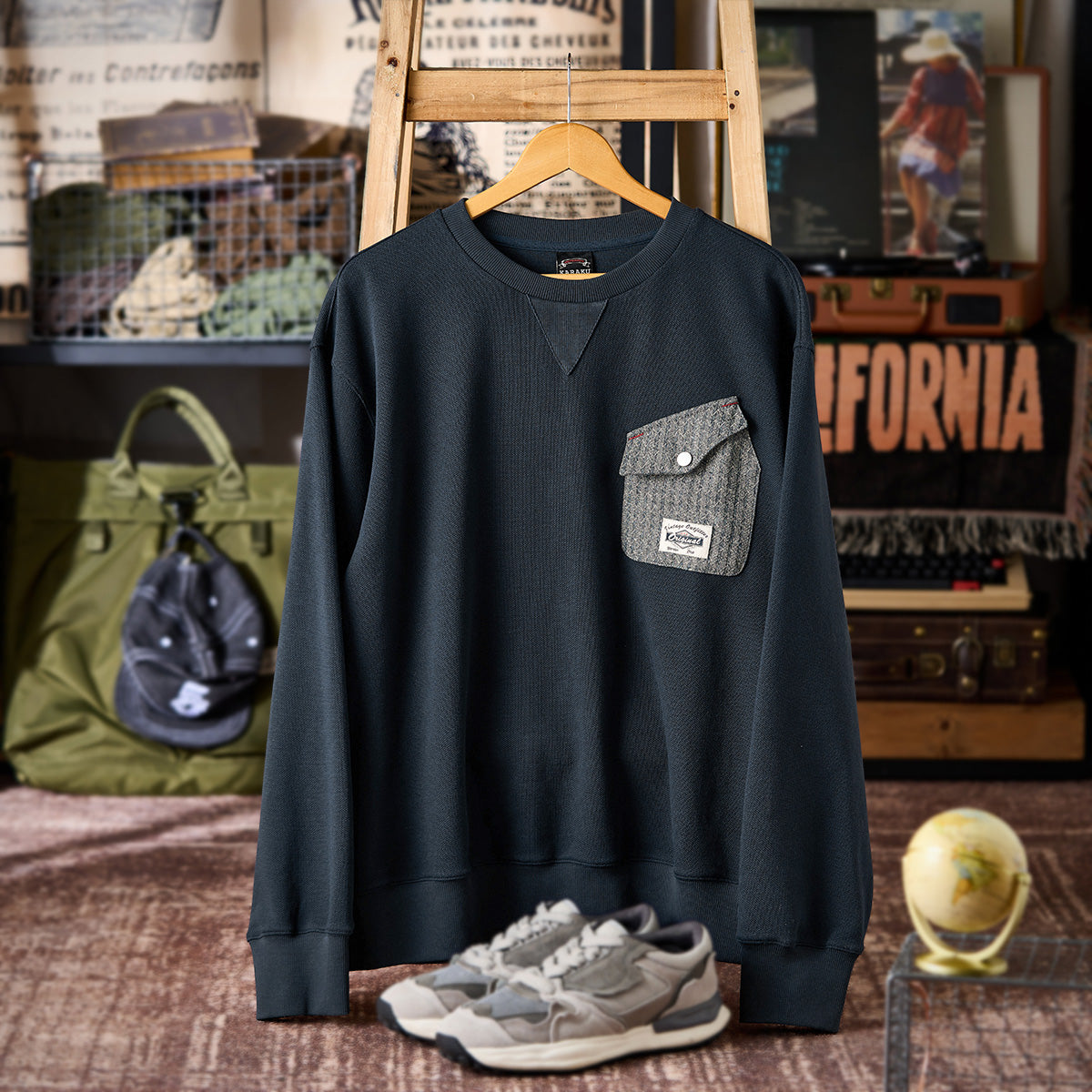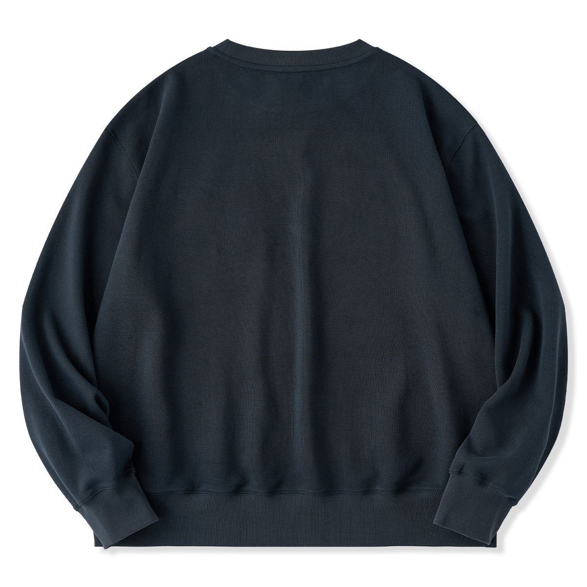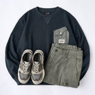 クルーネック部分にリブ素材の三角パッチがあり、クラシカルなスウェットシャツデザインを踏襲しています。袖や裾のリブがしっかりしており、着心地の良いリラックス感が期待されます。