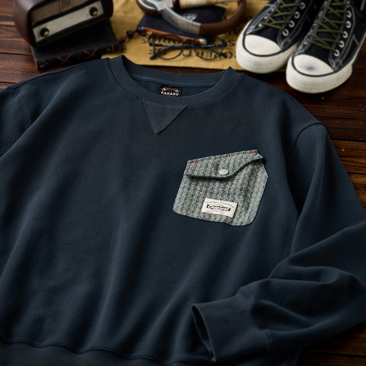 【予約】ヘリンボーンデニムポケット付き Vガゼットニットスウェット