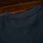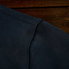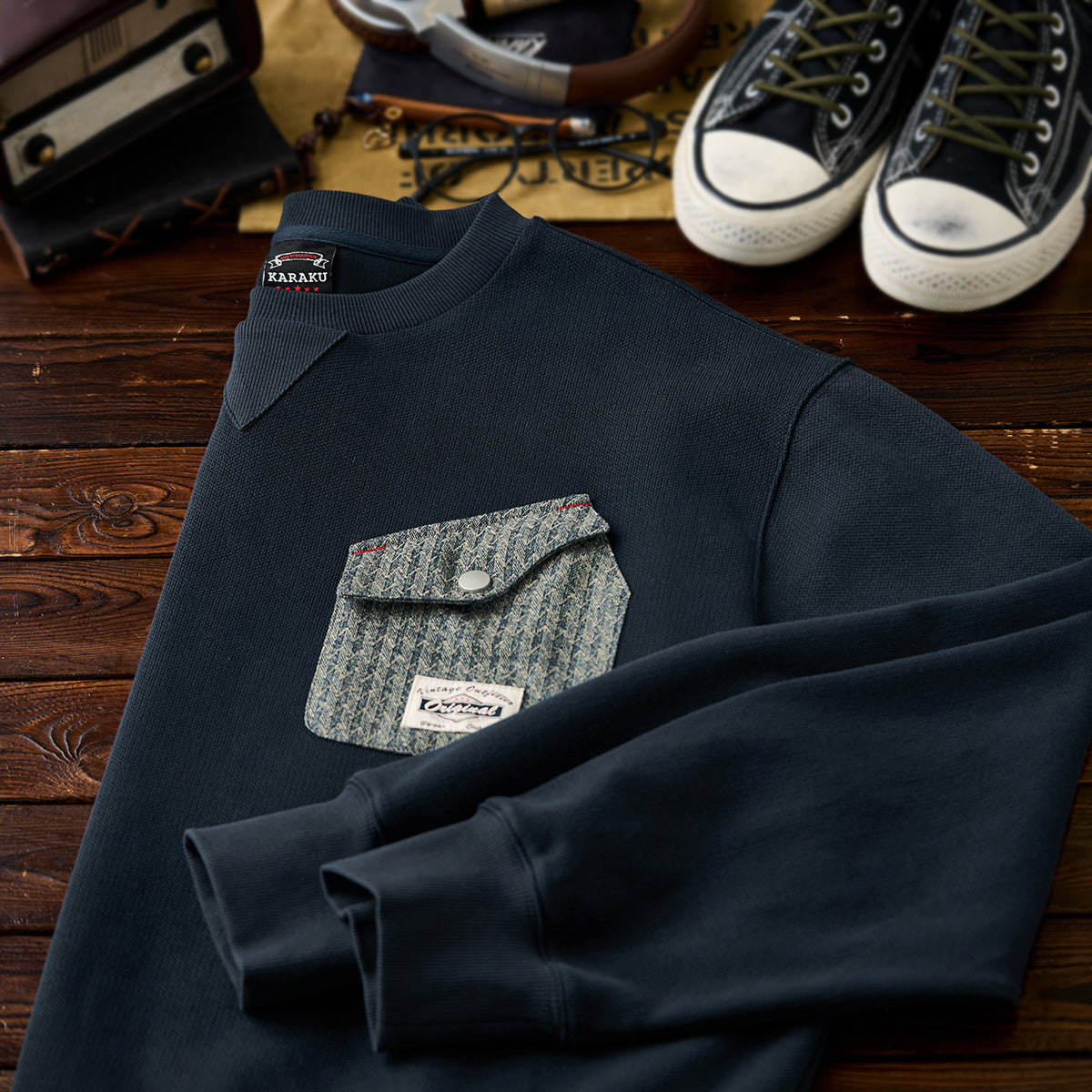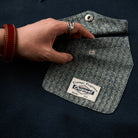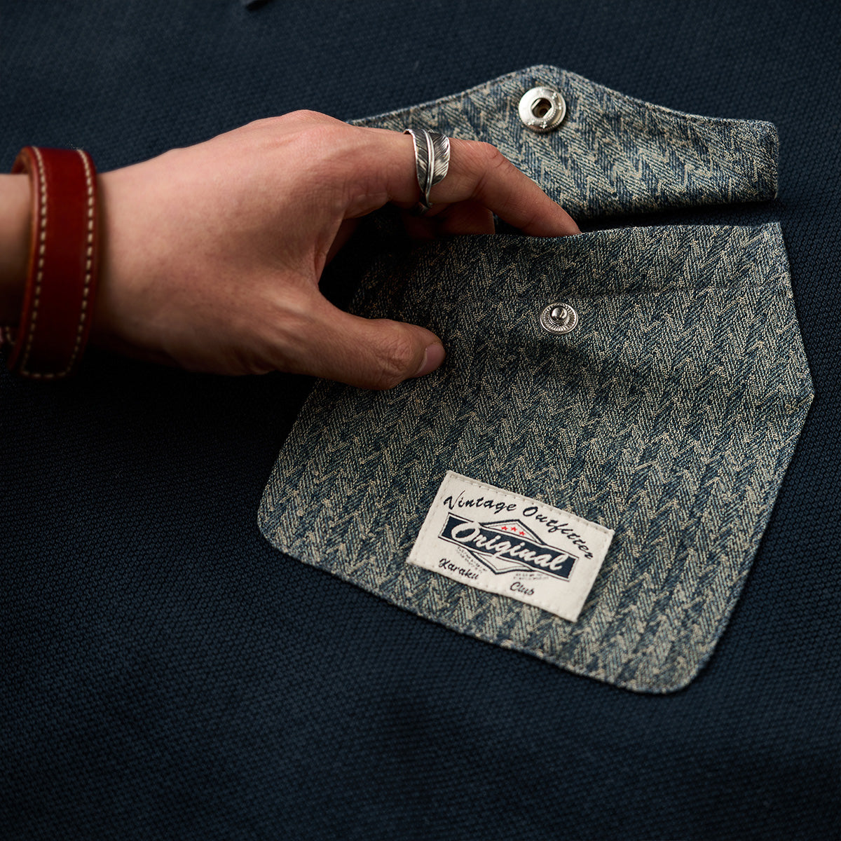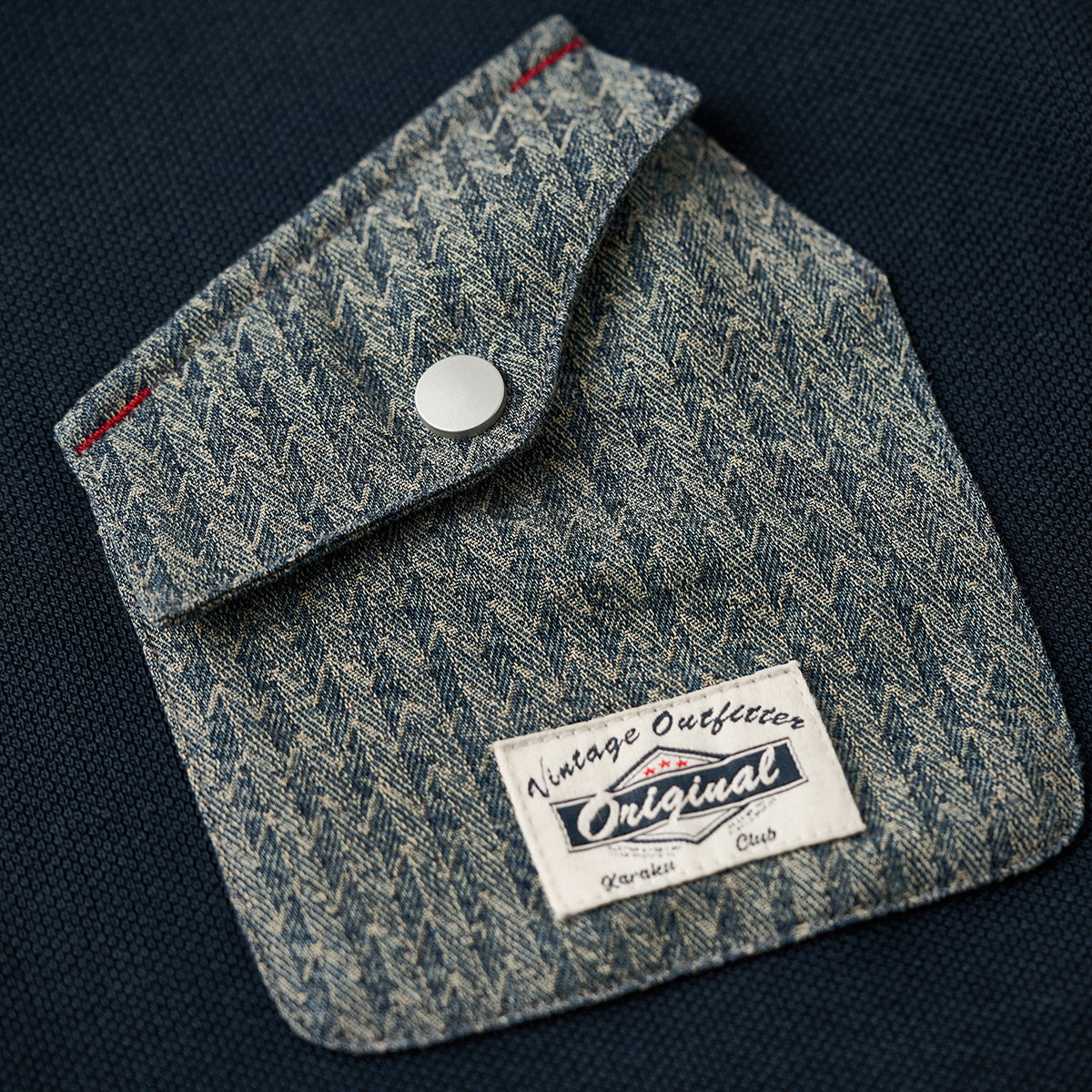 左胸部分のヘリンボーンデニムポケットのデザインには異素材を使用しており、全体のシンプルなベースカラーと対照的で目を引きます。ポケットのフラップには、シルバーのボタンが付いており、実用性と装飾性を兼ねています。上部に赤いステッチが入っており、さりげないアクセントとして機能しています。
