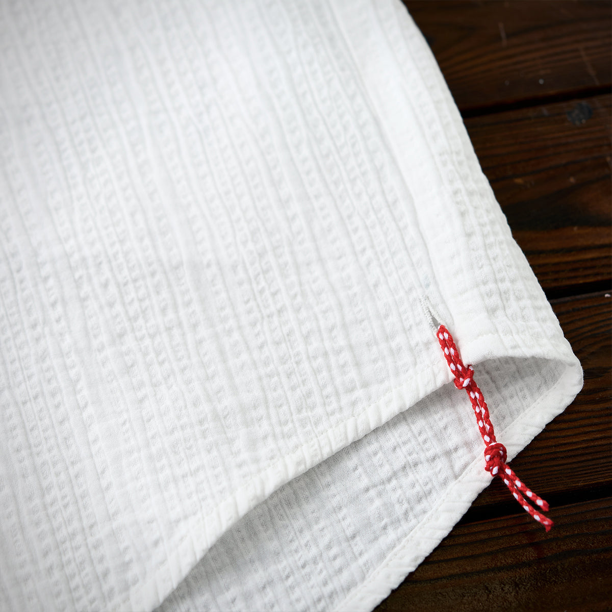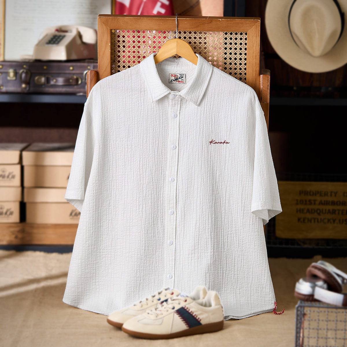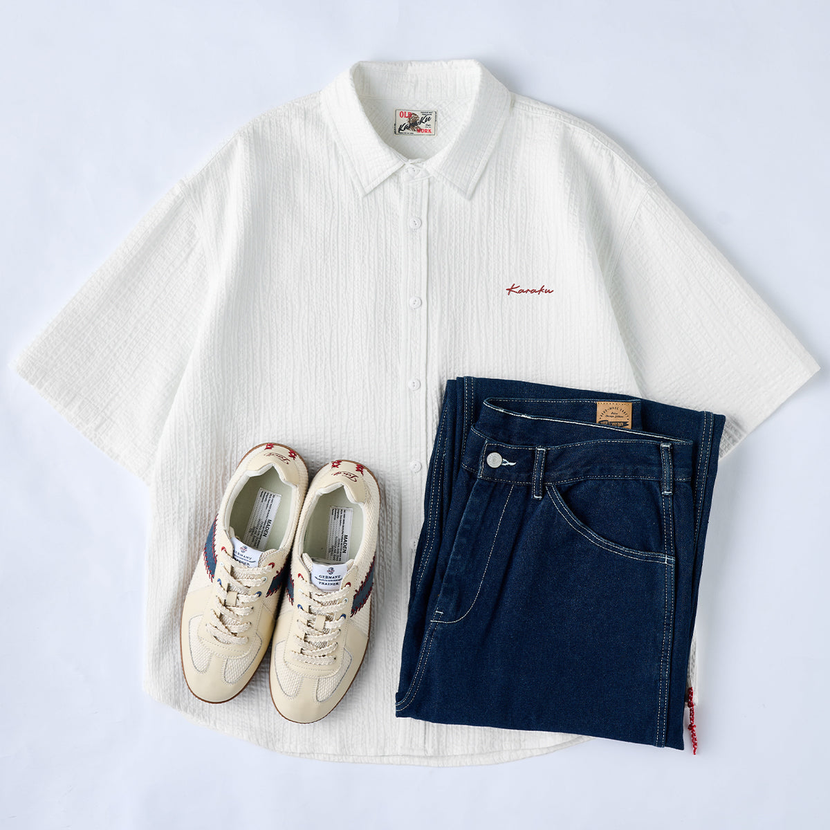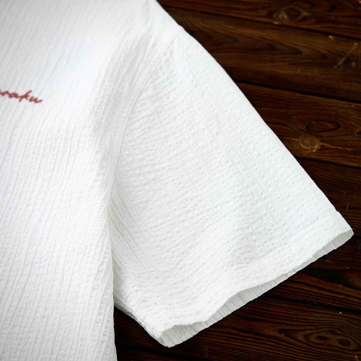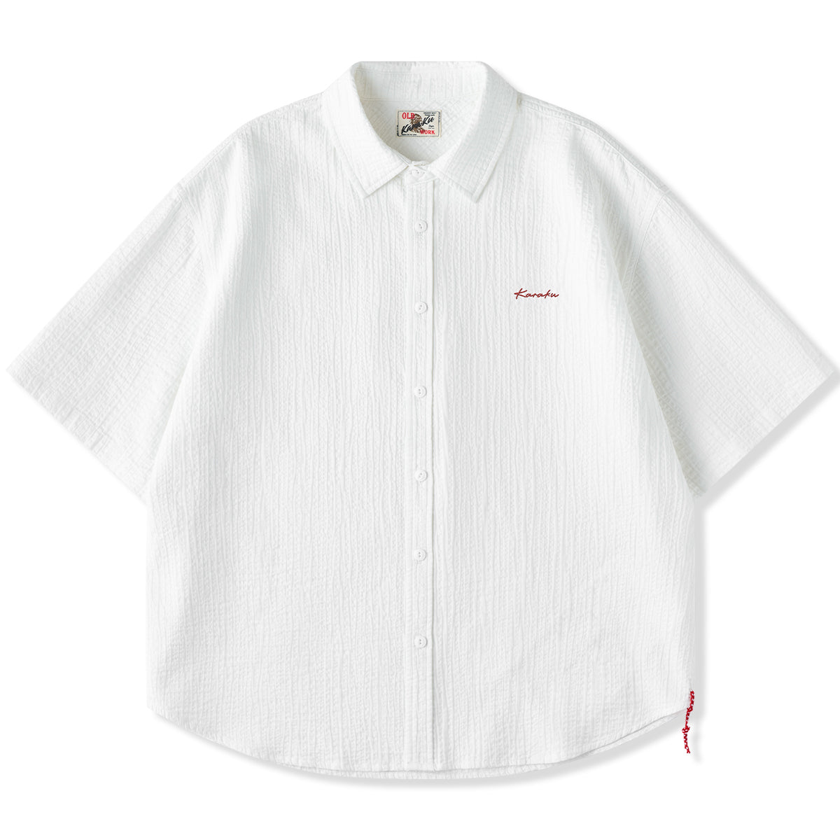 【予約】「Karaku」ワンポイント刺繍入り 赤ヒモ付きテクスチャー半袖シャツ