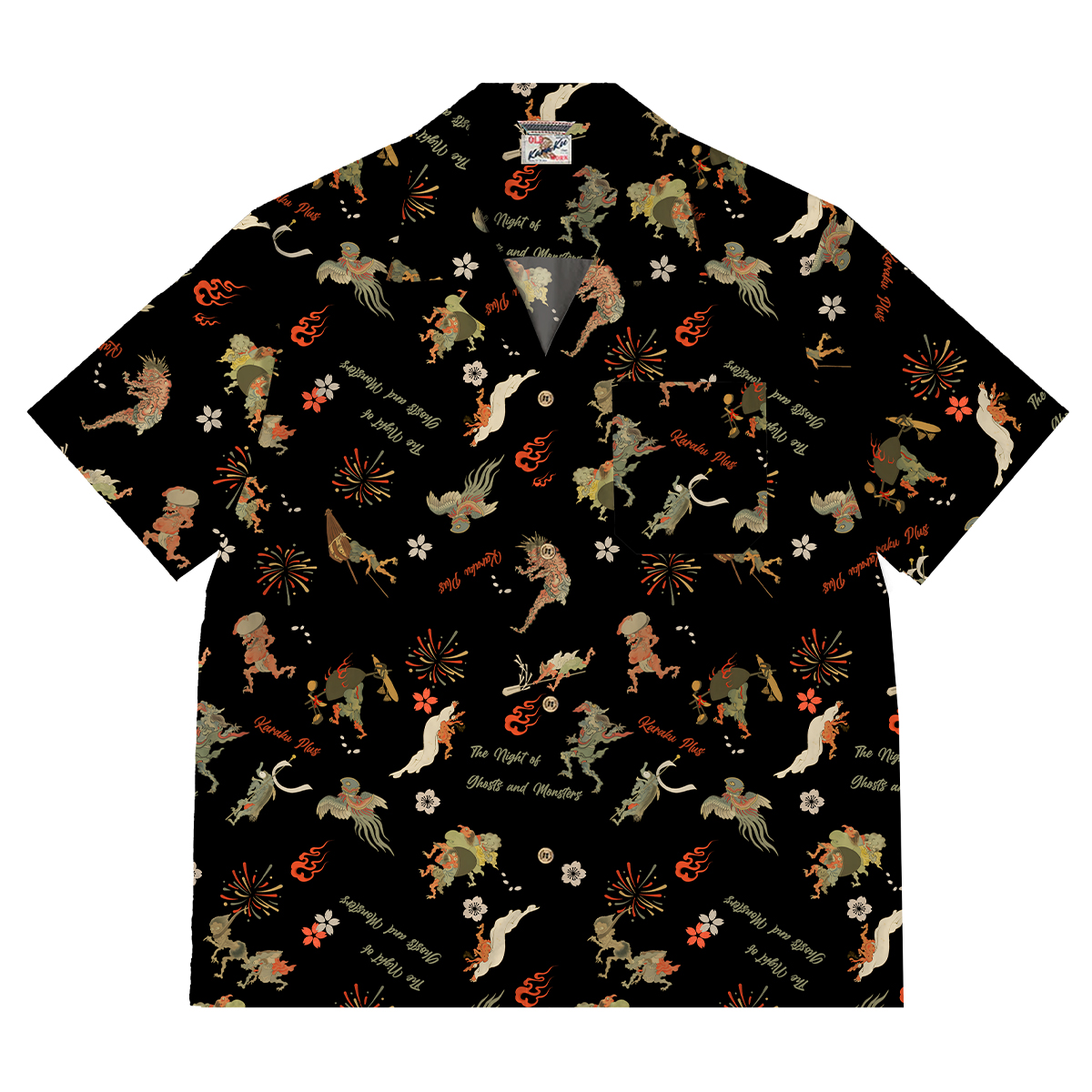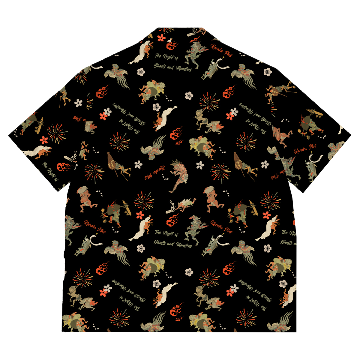 本アイテムでは多様な妖怪が登場しており、夜の闇をイメージした黒い背景を基調とすることで、百鬼夜行の神秘的な雰囲気を強調しています。それぞれの妖怪は伝統的な日本画や浮世絵のスタイルを取り入れたデザインで描かれており、古典的な要素を現代のファッションに落とし込んでいます。花火や花柄といった要素が、夏祭りの明るく楽しい雰囲気を表現しています。
