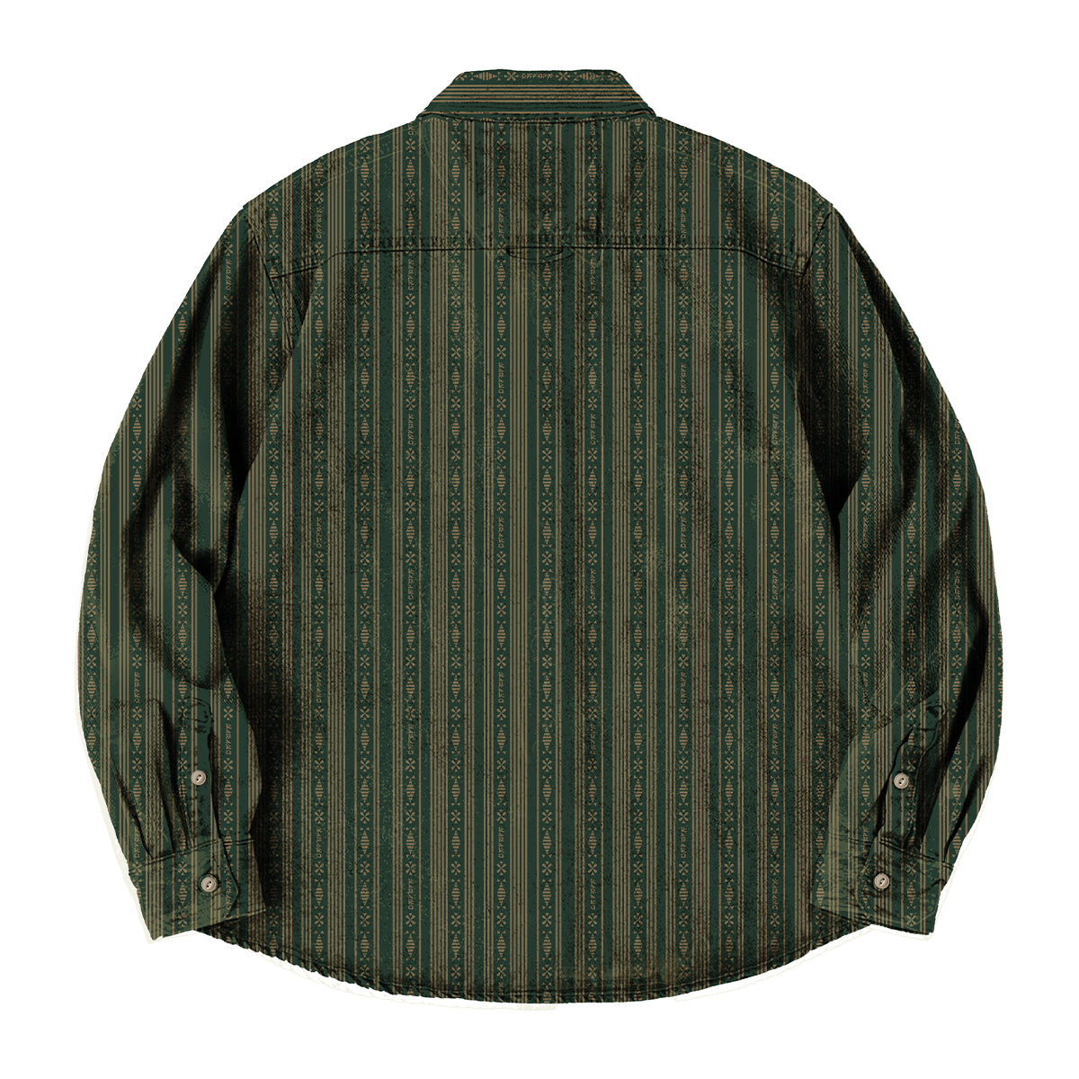 民族風の幾何学模様と「Karaku」ロゴをリズミカルに組み合わせ、繰り返し配置することで生まれたオリジナルストライプデザイン。単なる縞柄ではなく、伝統的なエスニック文様の奥行きとブランドのアイコン性が融合した、存在感のある一着に仕上げました。一枚で主役としてはもちろん、ジャケットやベストのインナーとしてもコーディネートに奥行きをプラス。細部に宿るデザイン性が、さりげなく“らしさ”を演出してくれる、Karakuならではのストライプシャツです。