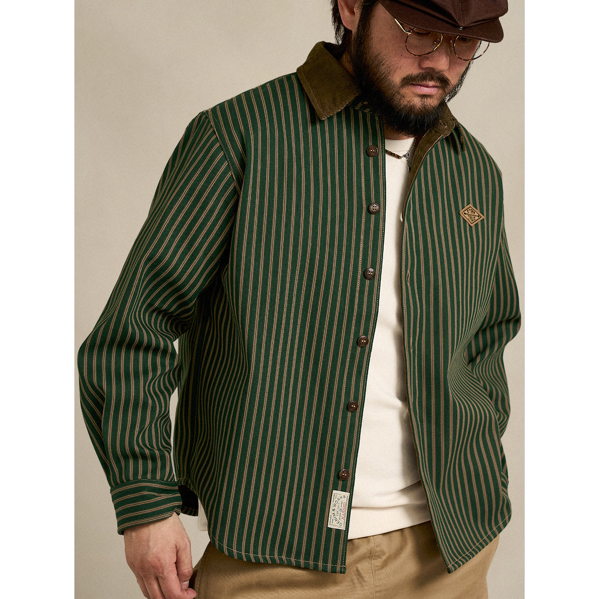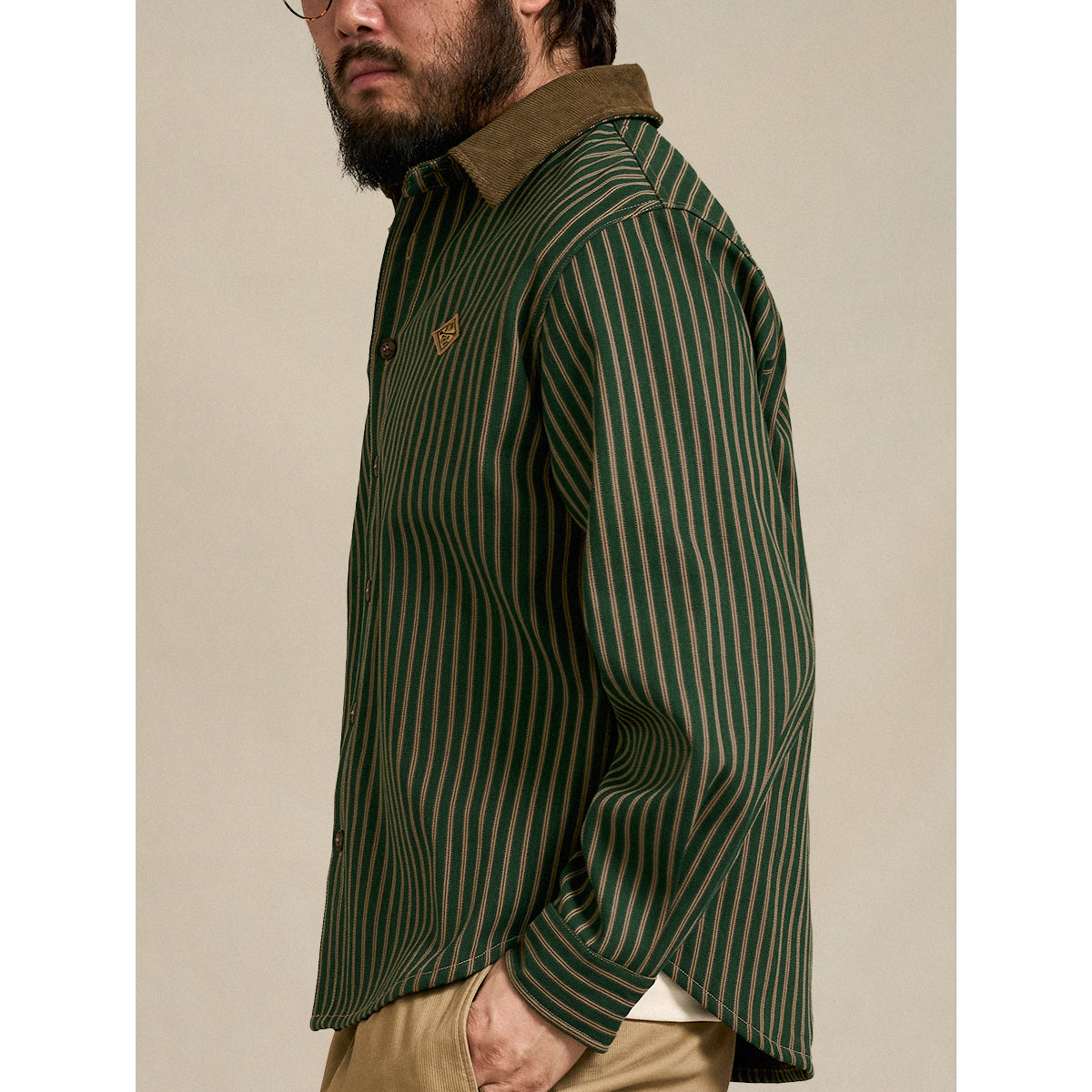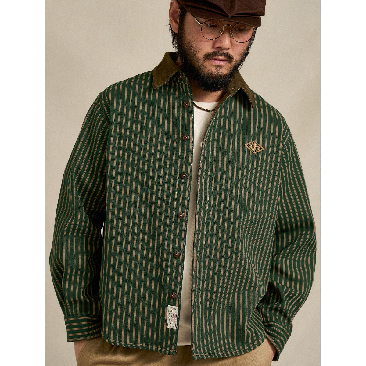 クラシックなストライプ柄シャツに、裏フリース仕様を組み合わせた、秋冬らしい温もりのある一着。襟や袖口の裏面にはコーデュロイ素材を切り替え、異素材の質感が引き立つデザインに。胸元には「STAY TRUE」刺繍ワッペンを配置し、メッセージ性とアクセントをプラス。カジュアルなスタイリングはもちろん、アウター感覚でも着こなせる万能シャツ。保温性・デザイン性ともに優れた、秋冬の主役アイテムです。
