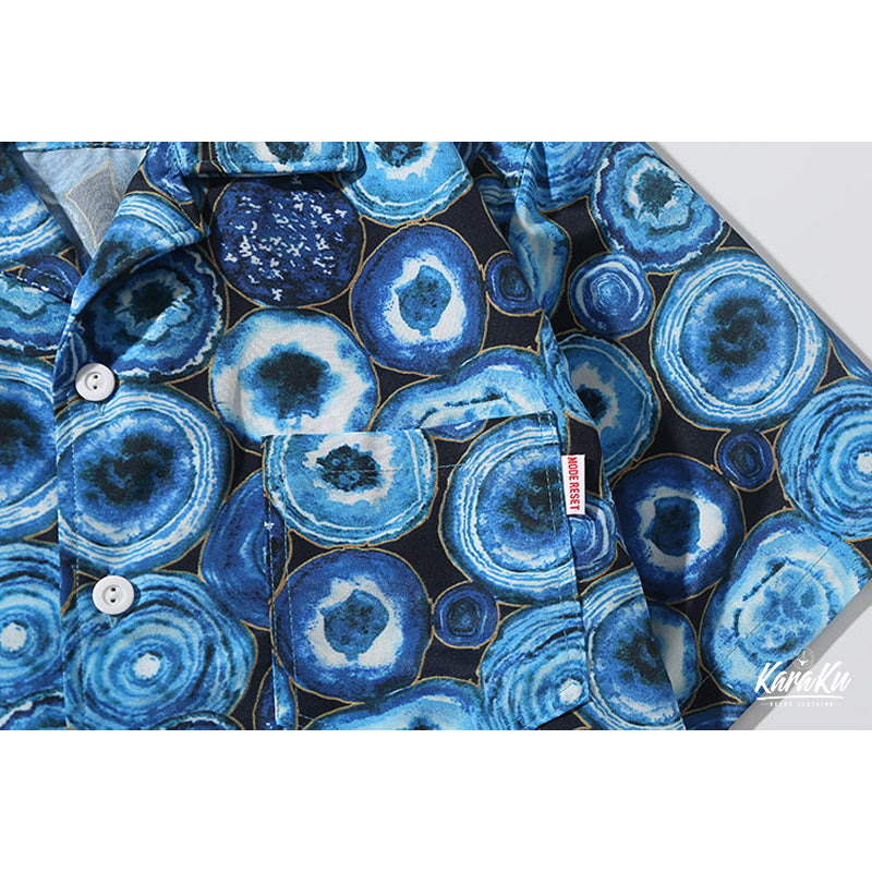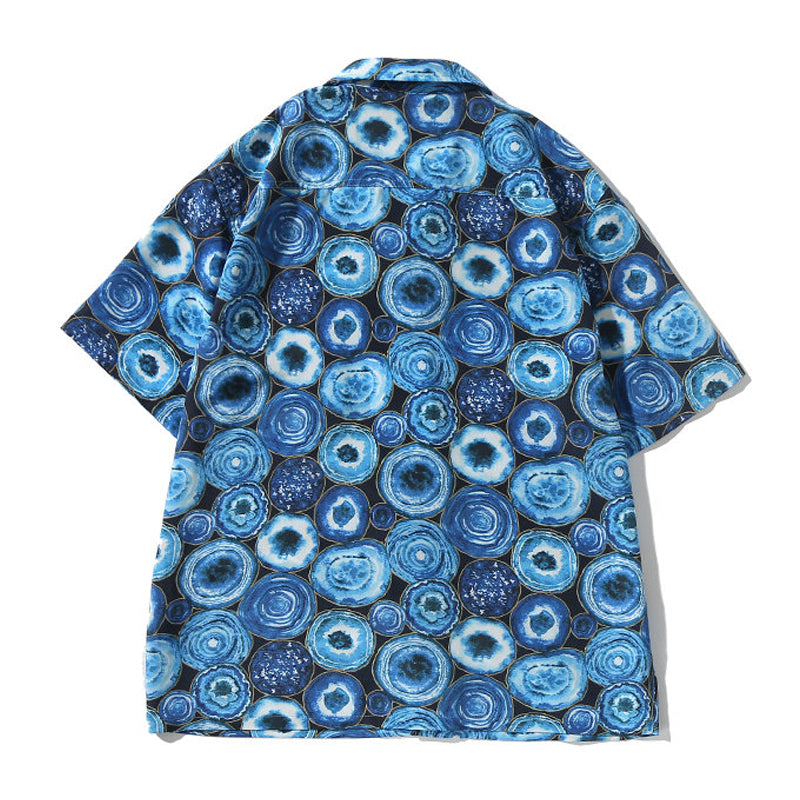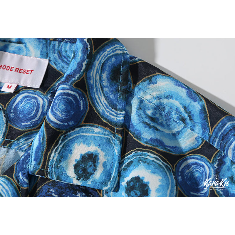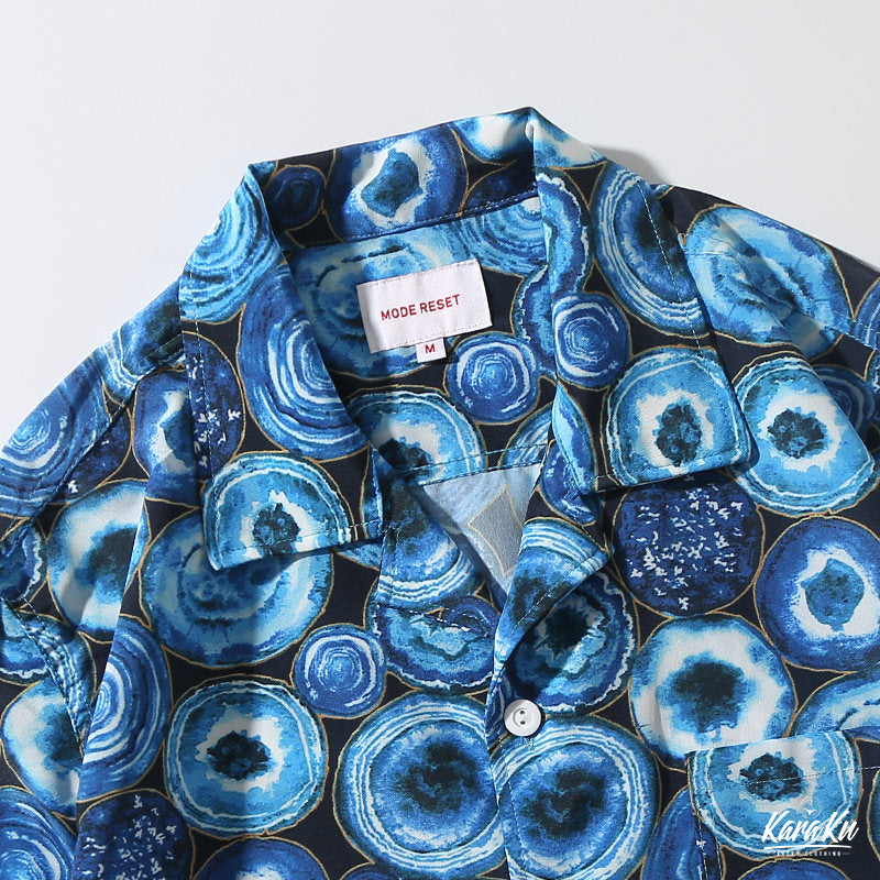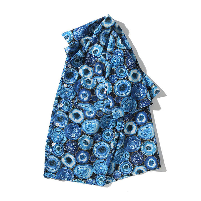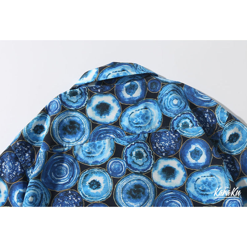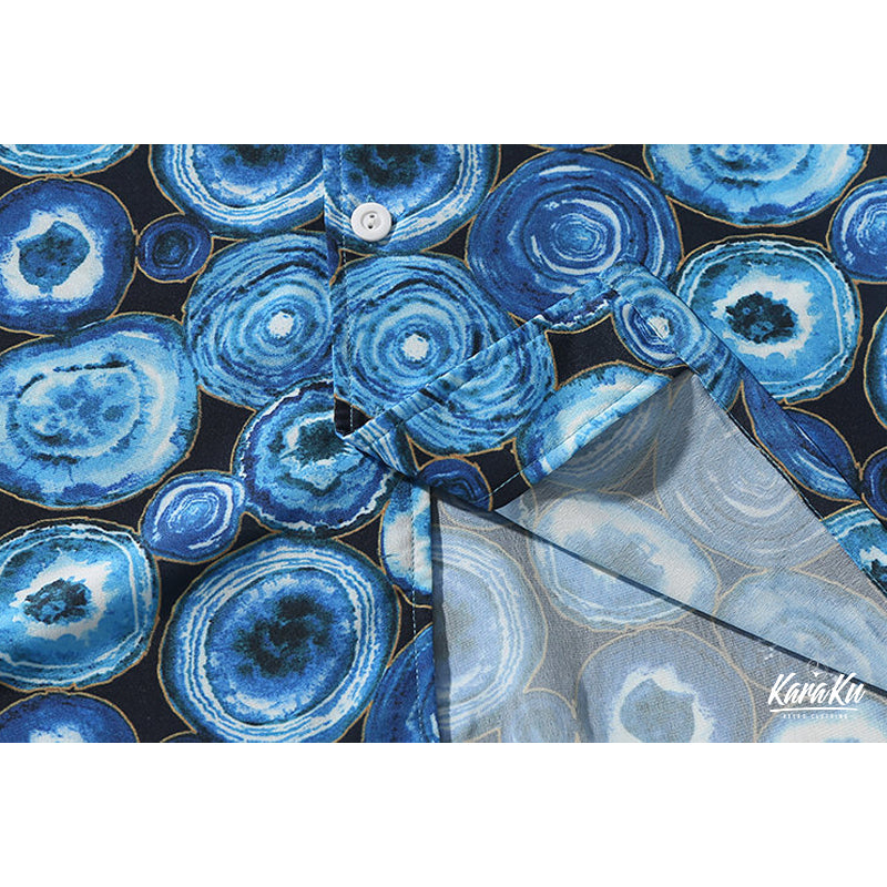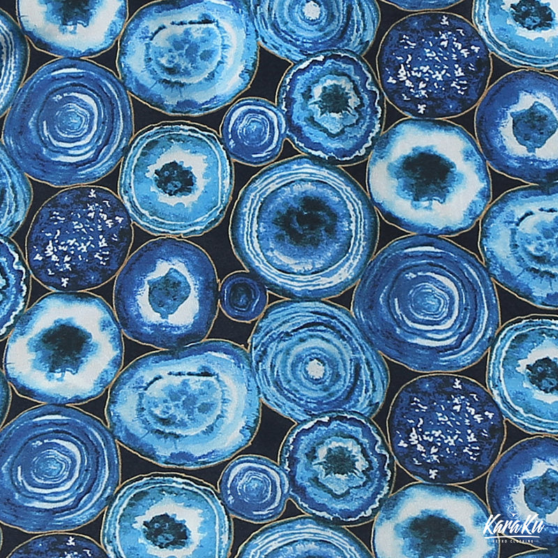 油絵のような質感を持つ丸形のプリントに金色の縁取りを描き出す。デザインの中央部分には、大きな丸形があり、その周りには小さな丸形が連なって、丸形は深い色合いのブルーを使用し、金色の縁取りがより際立ち、高級感のあるデザインに仕上がっている。