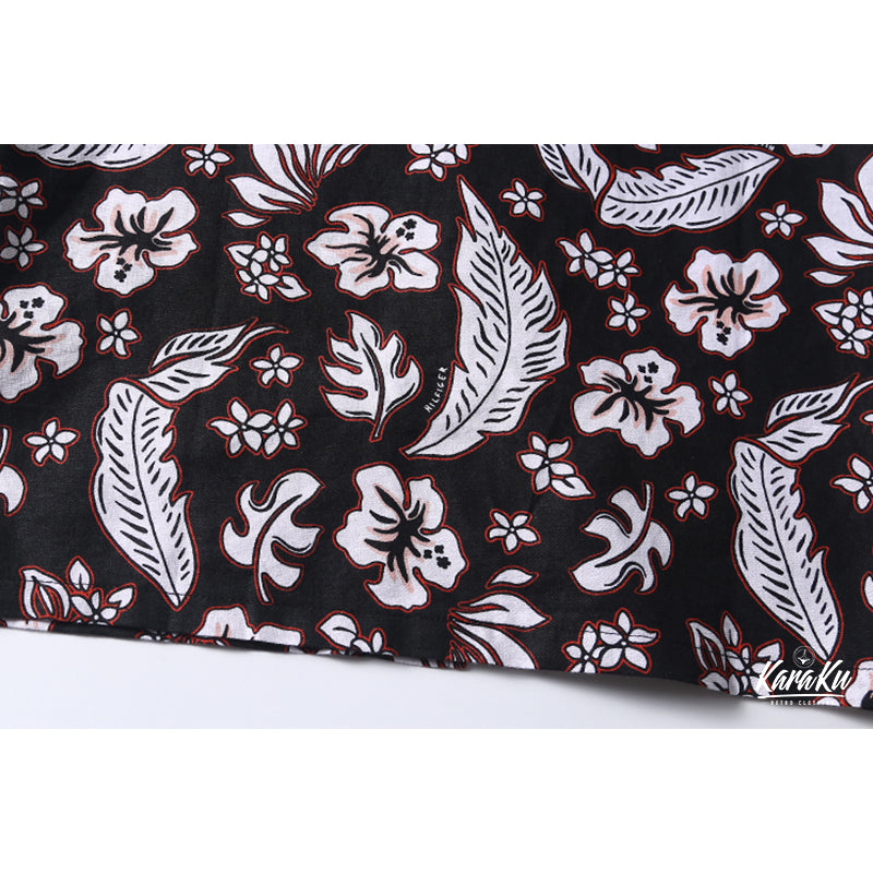 ブラックベースの色を使用することで、洗練されたエレガントな雰囲気。トロピカルフラワー総柄のデザインは、自然との調和を表現。自然の美しさや豊かさを感じさせるデザインであり、心地よいリゾートやビーチの雰囲気を思い起こさせる。