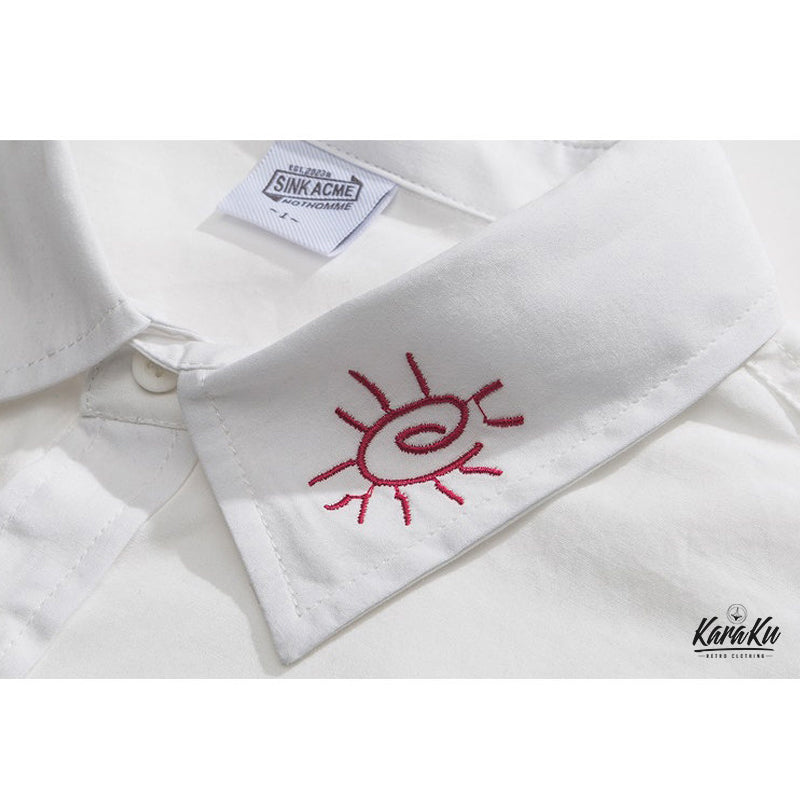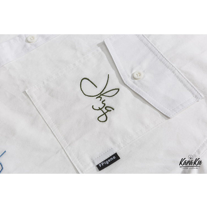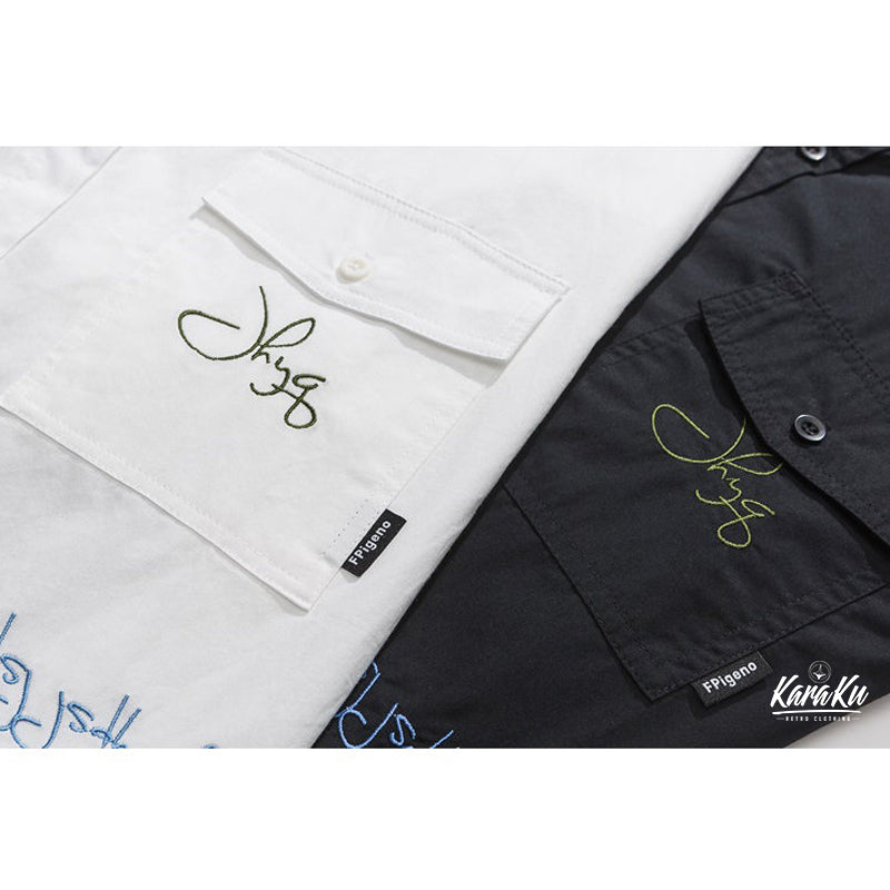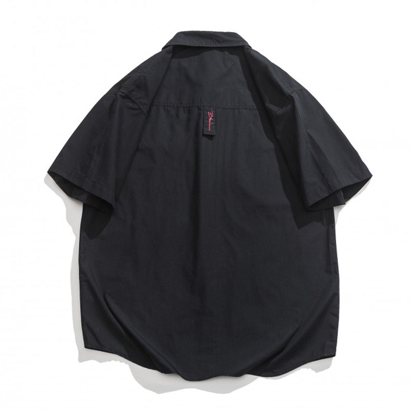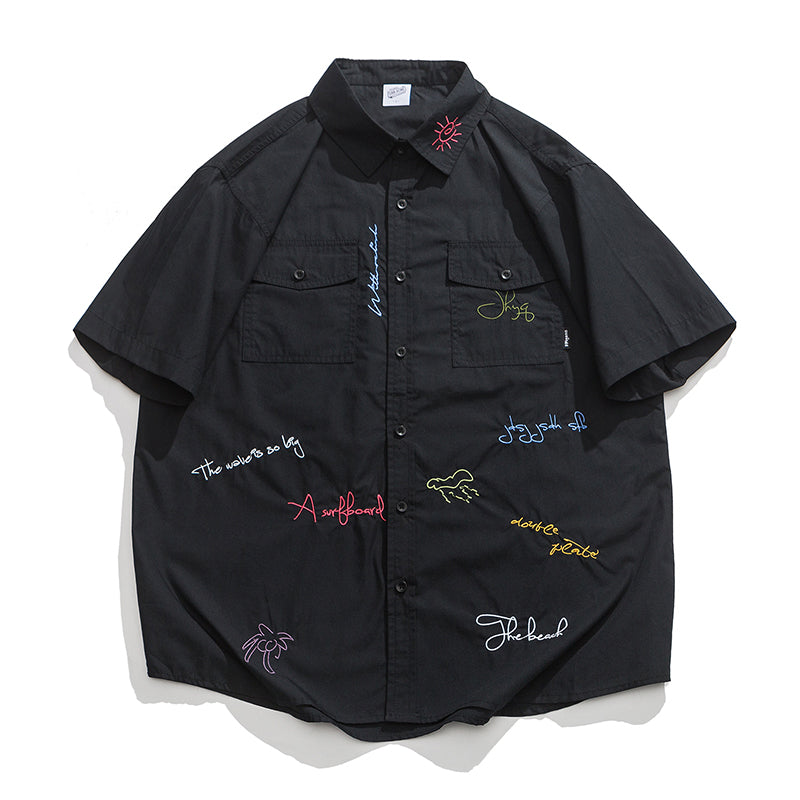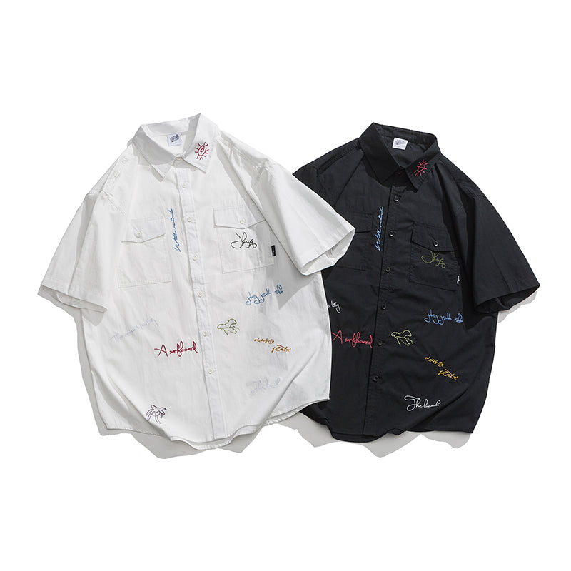 フロントとバックに落書きデザインの刺繍を落とし込んだ半袖シャツ。 英字やイラストを立体感のある刺繍で施した大人の遊び心をくすぐるデザイン。 一枚でメインのトップスとして活躍でき、シンプルで落ち着いたカラー使いなのでどんなコーデでも相性抜群! 胸元にポケットはワークティストを感じる、シンプルのデザインは洒脱でこなれた雰囲気になること間違いなし。