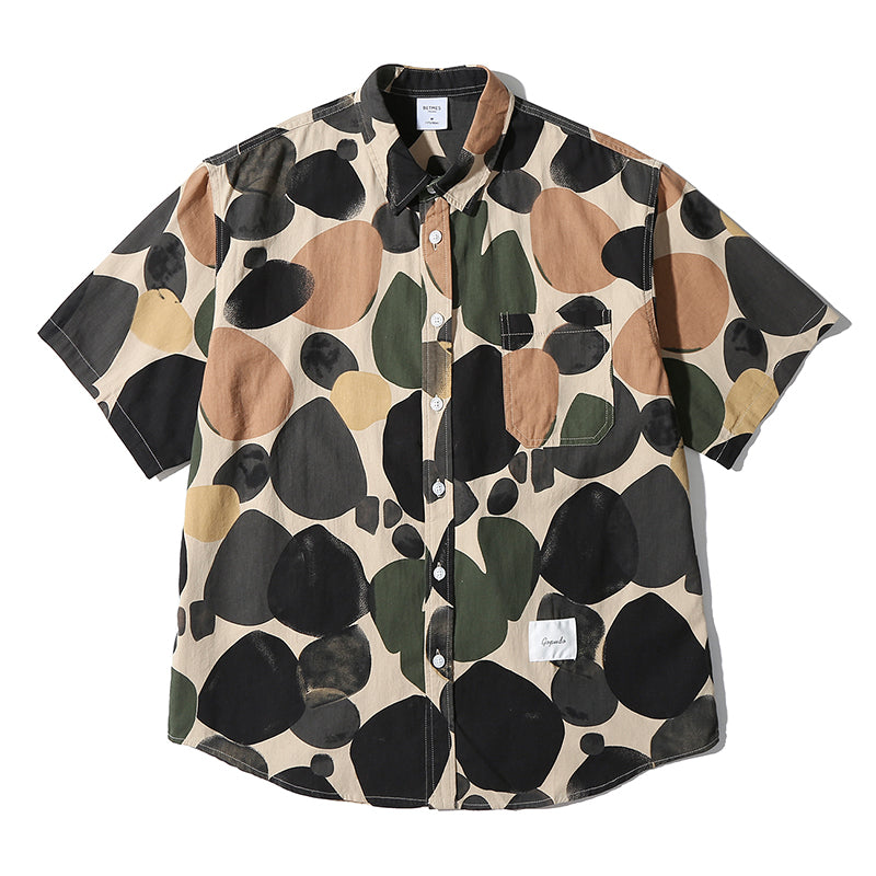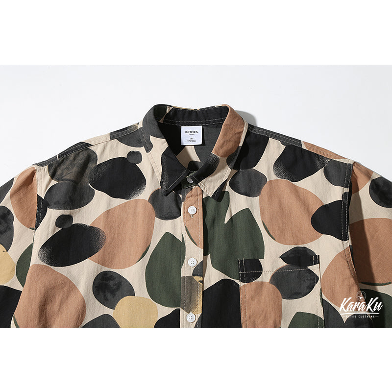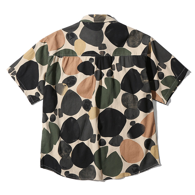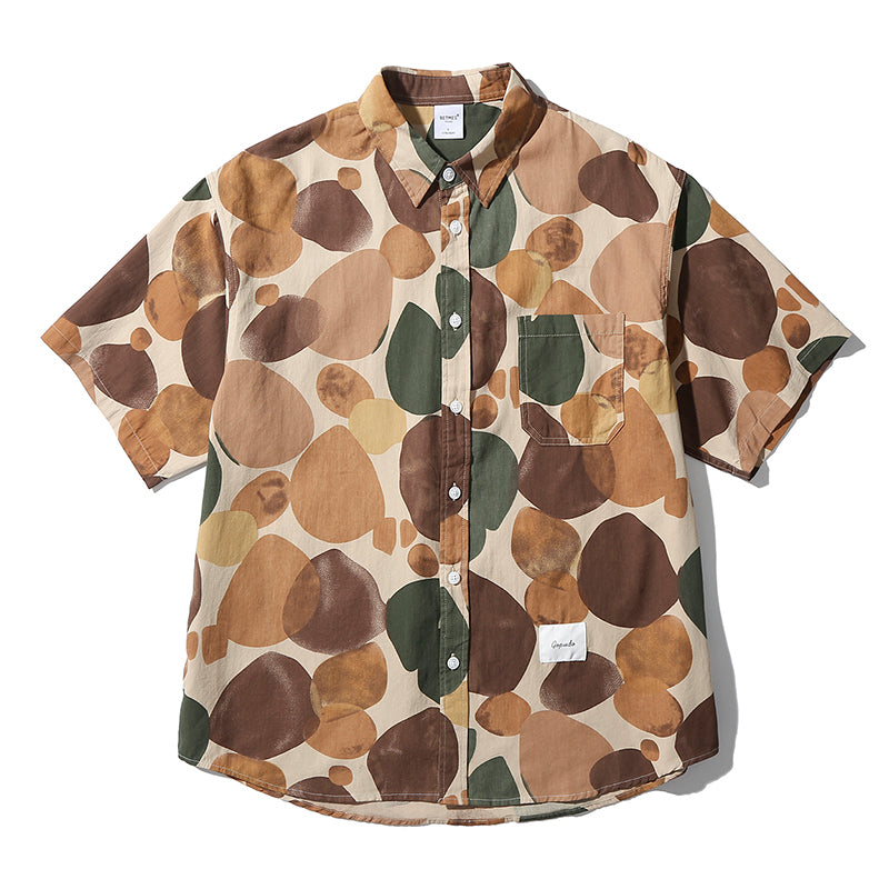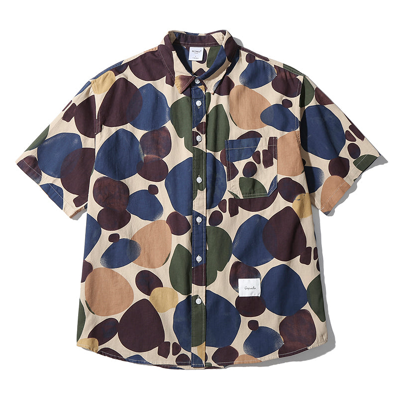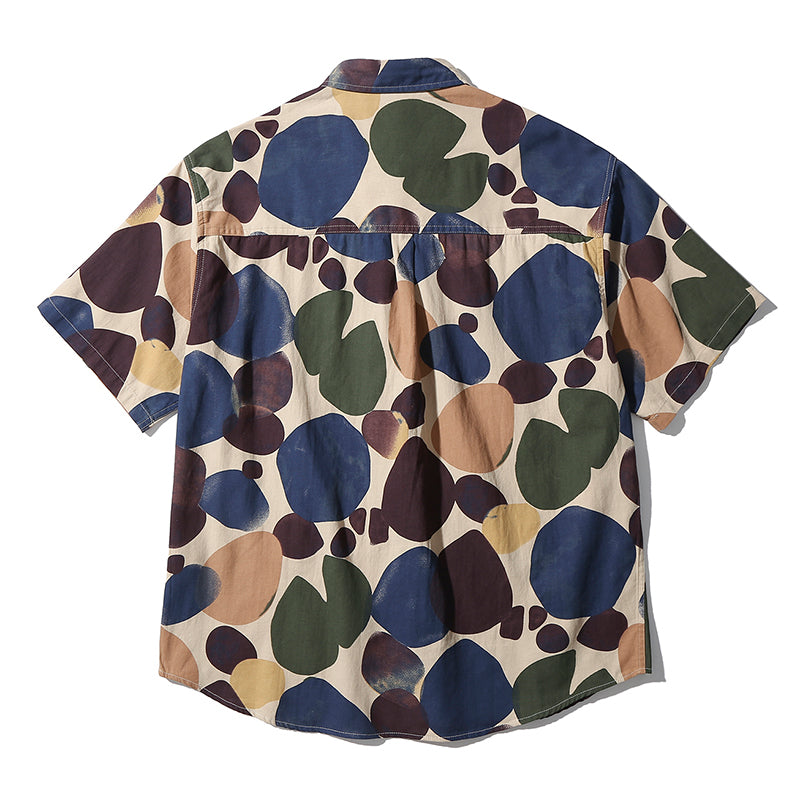 不規則な丸形パターンが総柄として全体に配置されて、丸形パターンは、サイズや位置がバラバラであり、無秩序ながらも統一感がある。このデザインは、自由でダイナミックな印象を与え、視覚的な興味を引く。