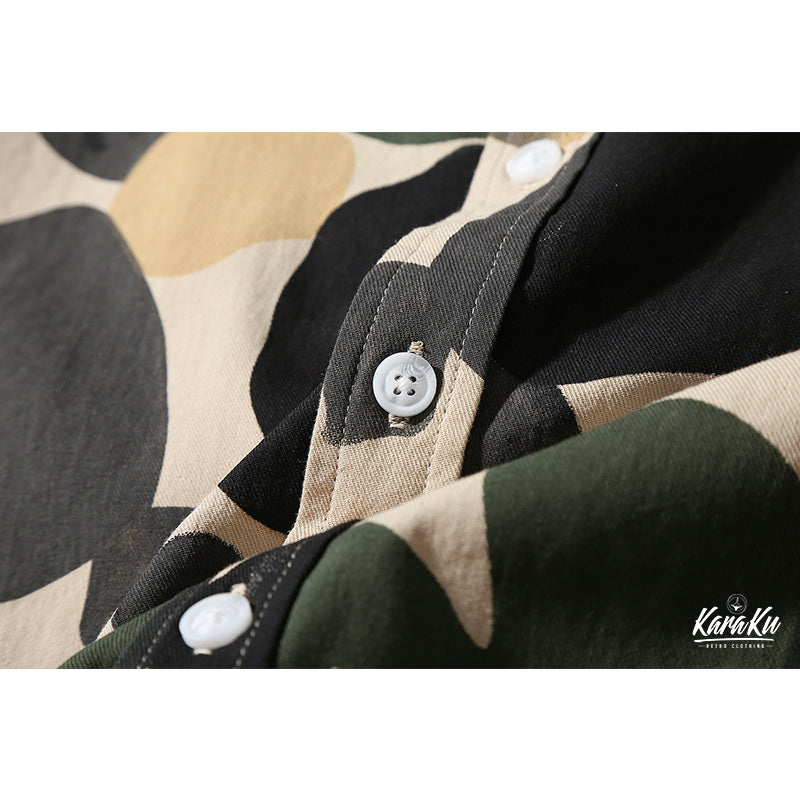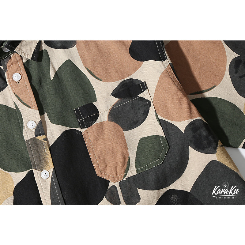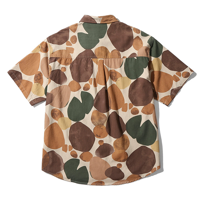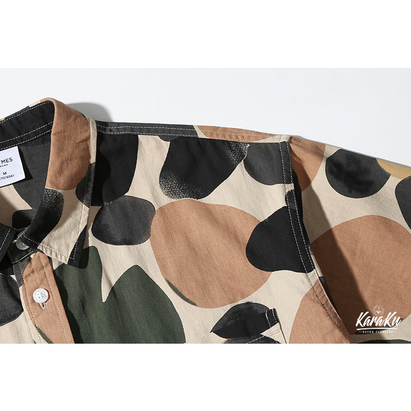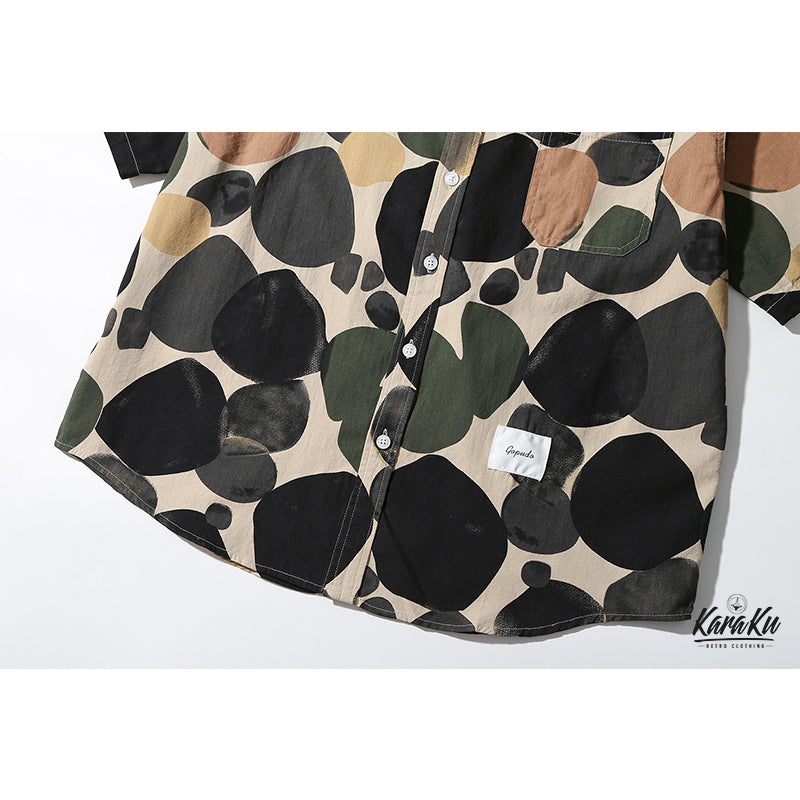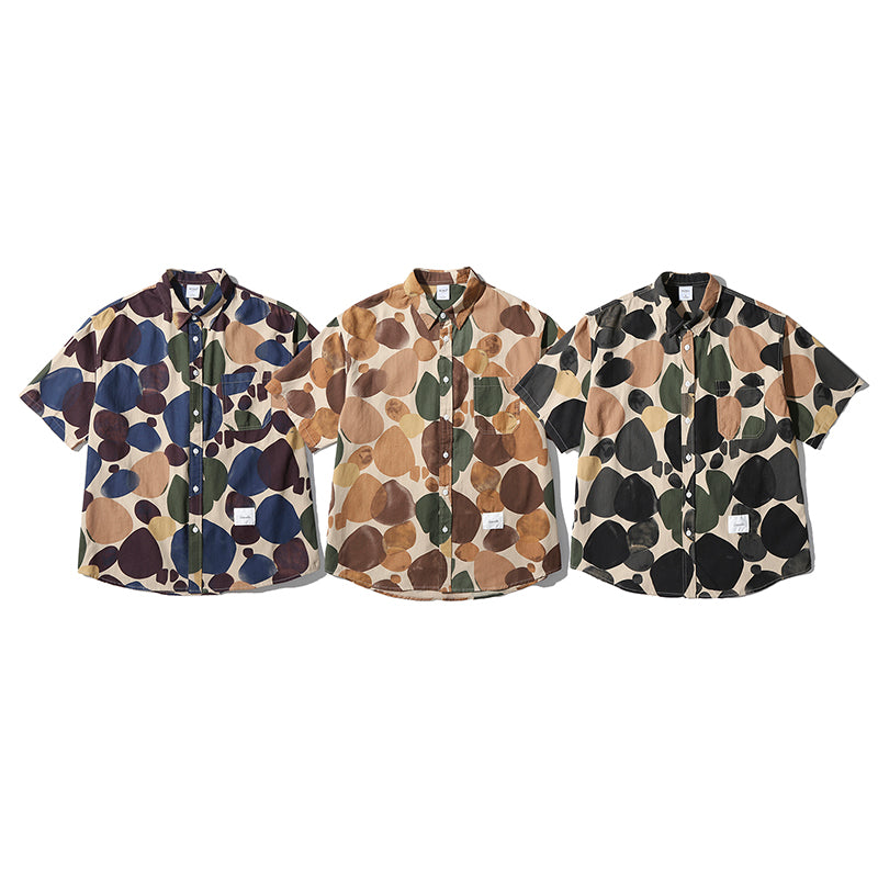 不規則な丸形パターンが総柄として全体に配置されて、丸形パターンは、サイズや位置がバラバラであり、無秩序ながらも統一感がある。このデザインは、自由でダイナミックな印象を与え、視覚的な興味を引く。