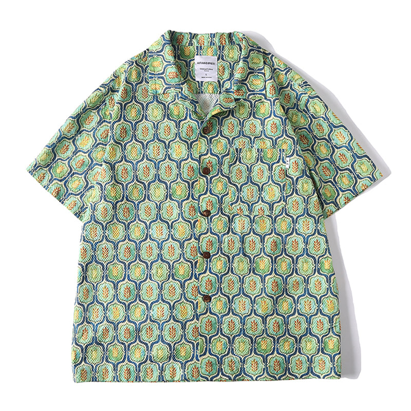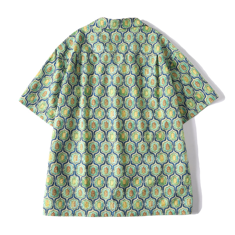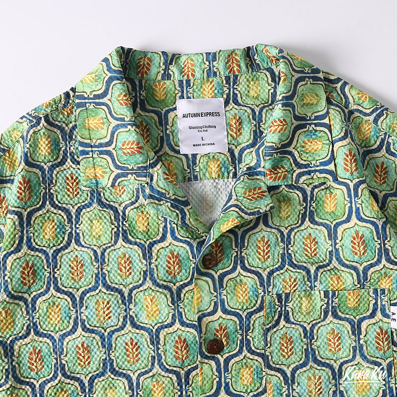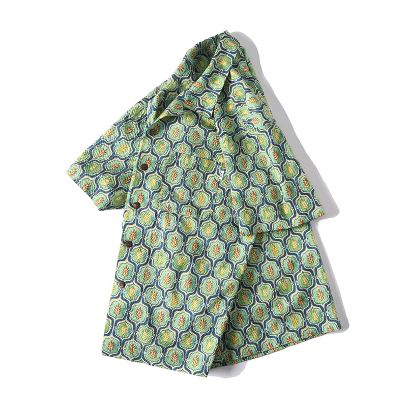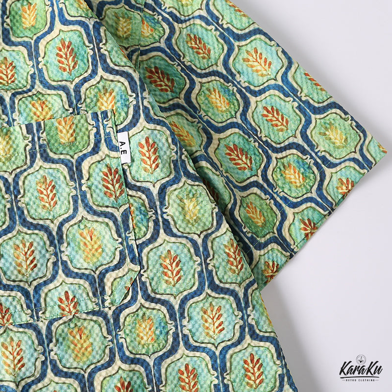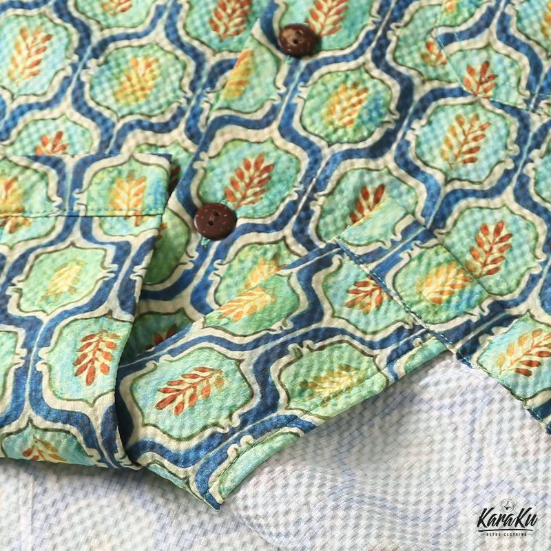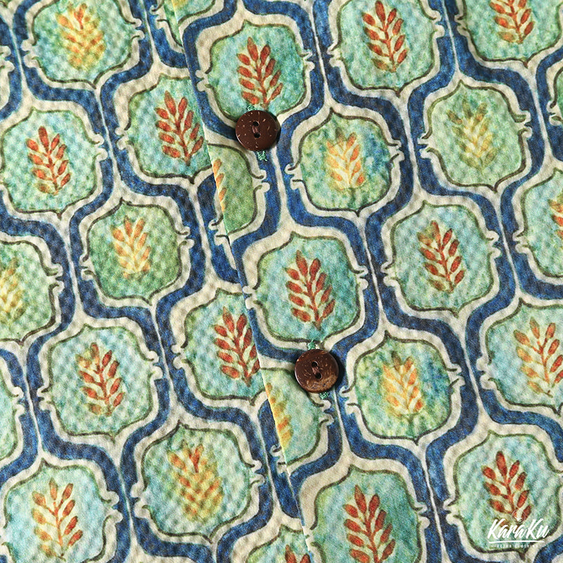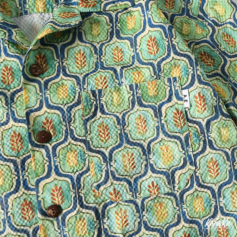 コーデを華やかに彩るキューバカラーシャツが登場!小葉模様のキリム柄がパッと目を引く。生地はオーダーメイドのシアサッカーを採用、波のような縞ができており、シワになりにくいなどの特徴があります。前立てでアロハシャツに多く見られるココナッツボタンを使われ、リゾートテーマをベースにデザインした一着は、抜群に夏のムードにマッチ。おしゃれなキューバ襟で、コーデの立体感をアップ、袖口の所はスペースを空いてるカットなので、もっと動きやすい。左胸元にポケット付き、小物を落とさないように同時に拘るポイント。