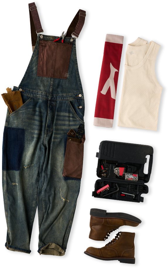 ガレージでオートバイの状態をチェックする際、マルチポケット仕様のデニムオーバーオールは、手元の工具を収納するのに便利です。
