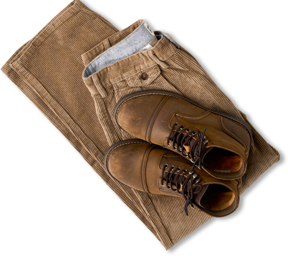 ヴィンテージライクな表情の太畝コーデュロイ生地を採用し、凸凹が空気を蓄えることができ、保湿性や吸湿性に優れている。