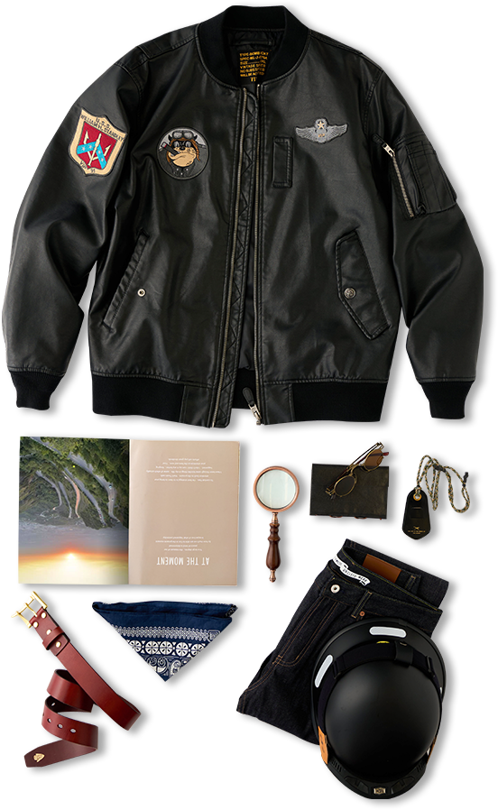 冷たい山風を遮る厚手のレザーと、MA-1特有の無骨なシルエットが、ライダーの背中に頼もしさを与える。曲がりくねる峠道を抜けるたび、ジャケットに刻まれるシワや傷が、旅の物語を静かに語りはじめる。