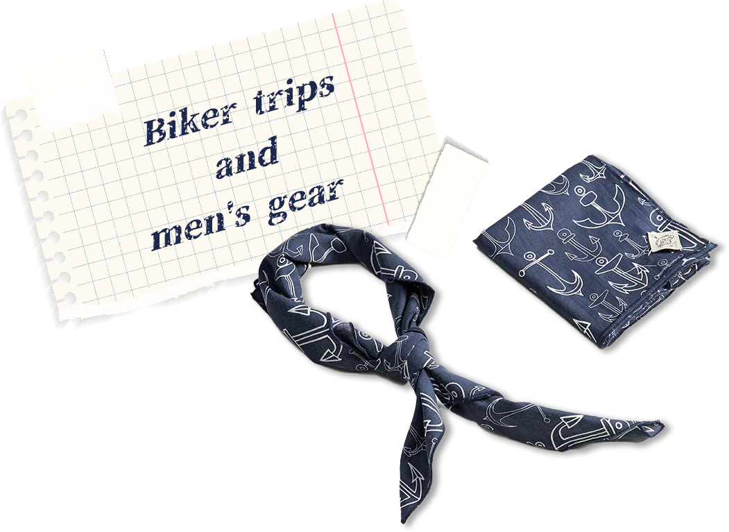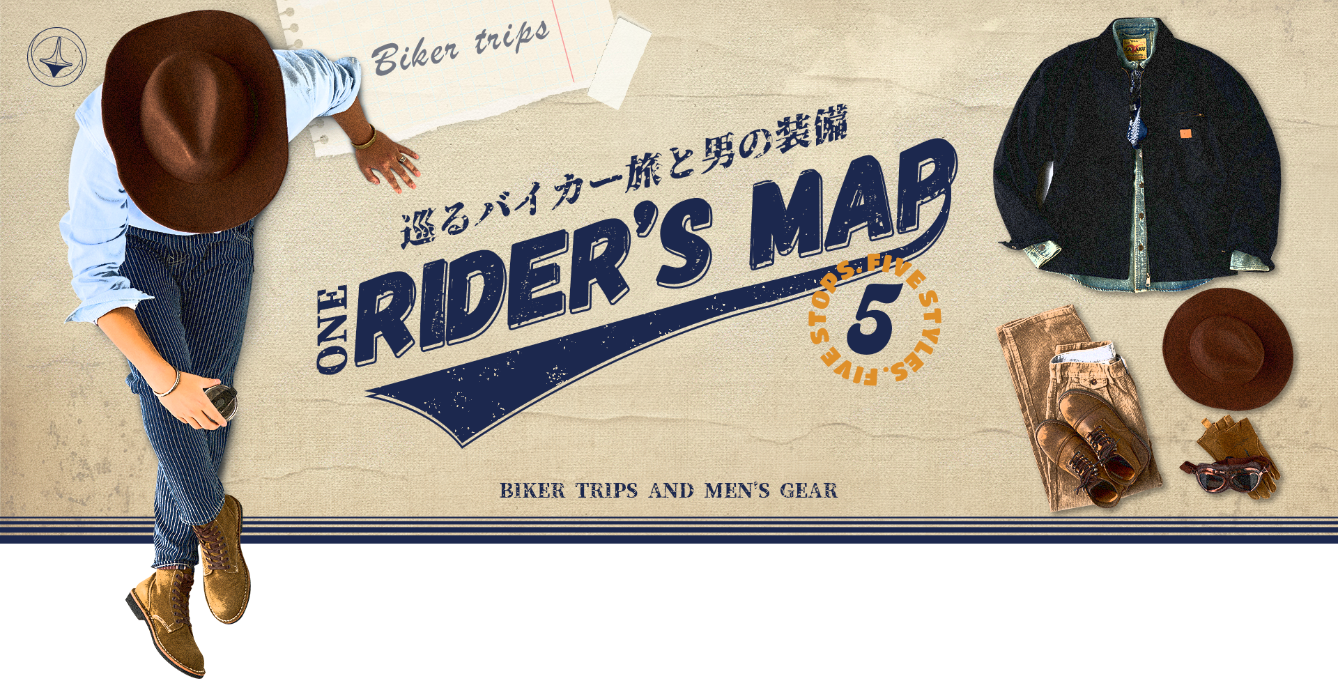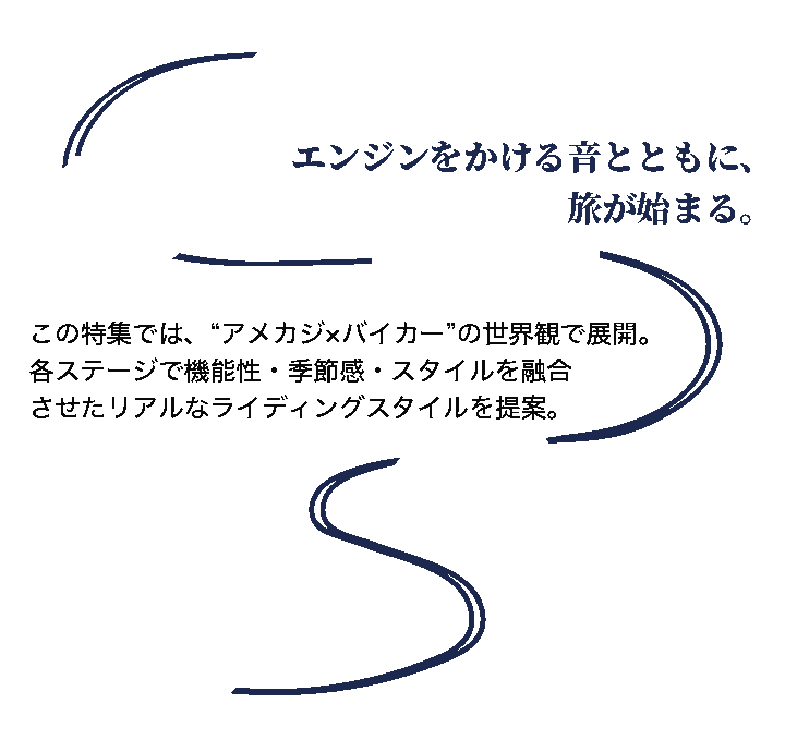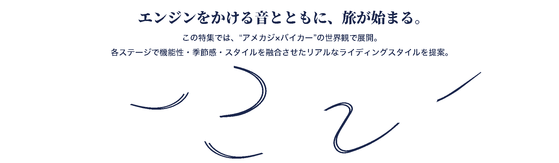 無骨なライダースタイルに、さりげない色と柄がアクセントを添え、旅の景色をより鮮やかに彩る。