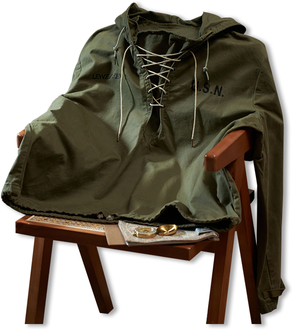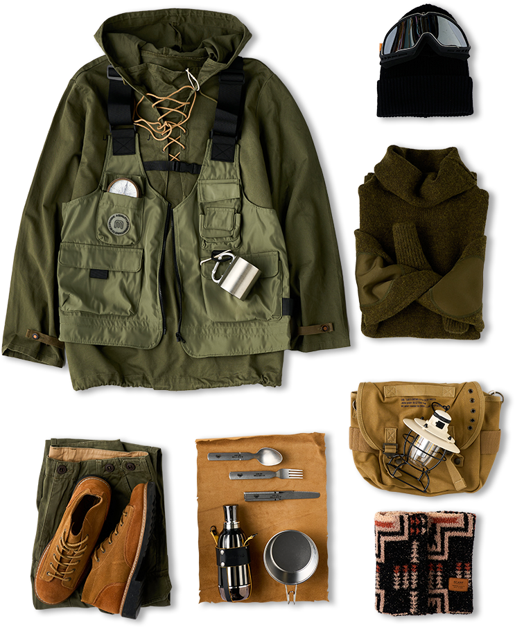 防風性・防寒性に優れたデッキパーカーが、湖畔の冷たい風や朝夕の寒さからライダーを守る。ミリタリーテイストの無骨なシルエットとディテールが、アウトドアのワイルドな雰囲気と絶妙にマッチし、旅の一瞬一瞬を力強く演出する。
