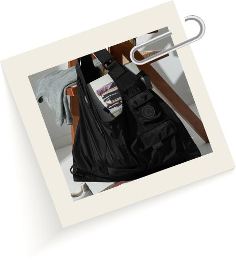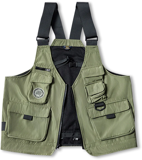 多機能ポケットを備えたタクティカルベスト・バッグは、地図や小物、キャンプ道具を手元に整理でき、ライディング中もすぐに取り出せる便利さが魅力。