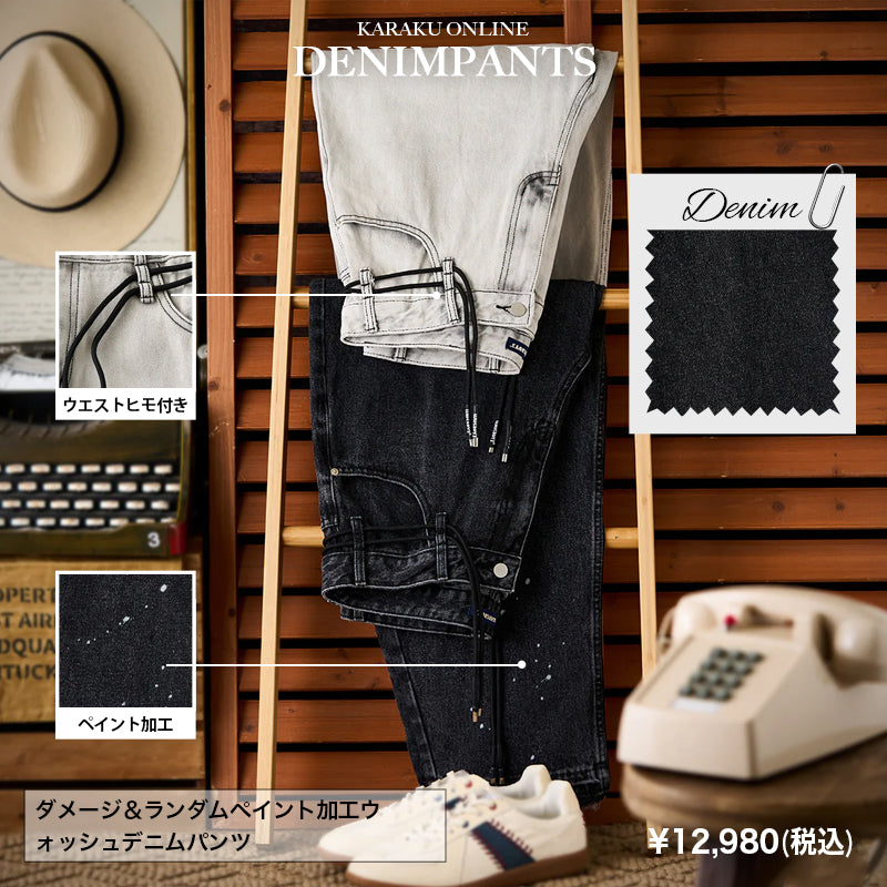 ハンドメイドダメージ&ウォッシュド加工 テーパードデニムパンツ