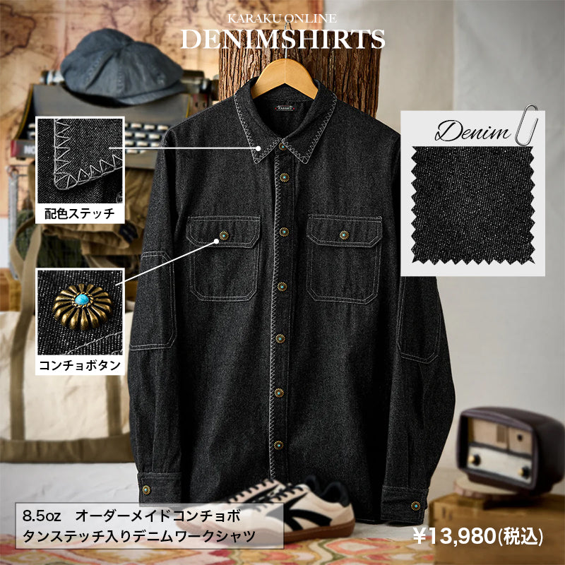 赤ヒモ付き 「Karaku」刺繍入りホワイトステッチデニムシャツ