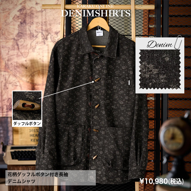 木調トグルダッフルボタン付き ペイズリー柄ジャカード織りデニムシャツ