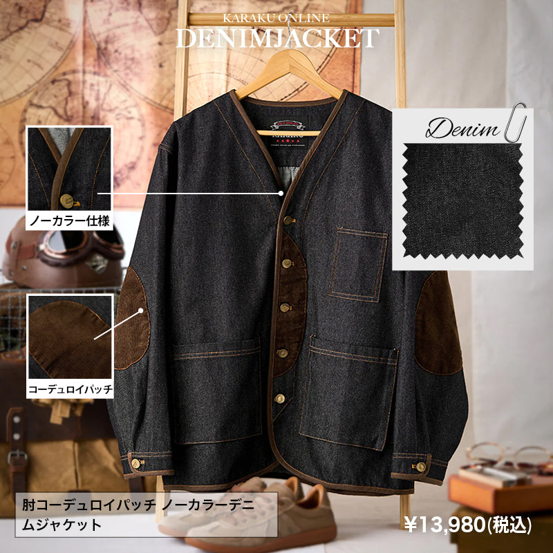 肘コーデュロイパッチ ノーカラーデニムジャケット