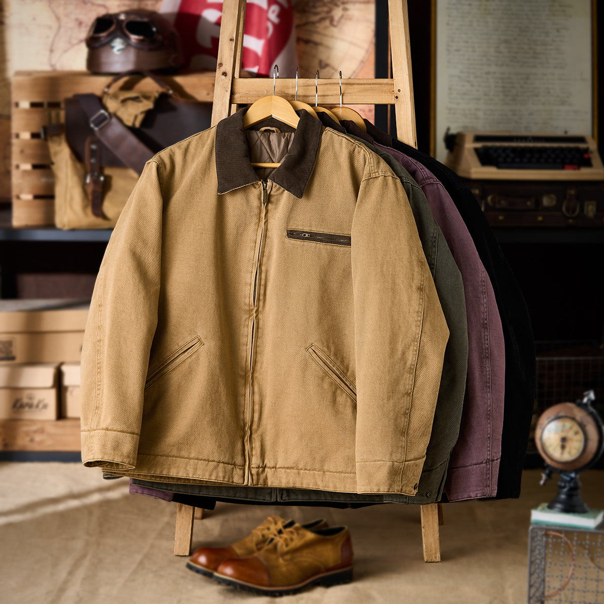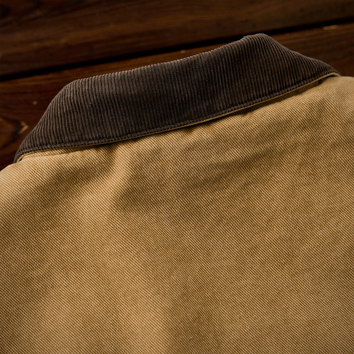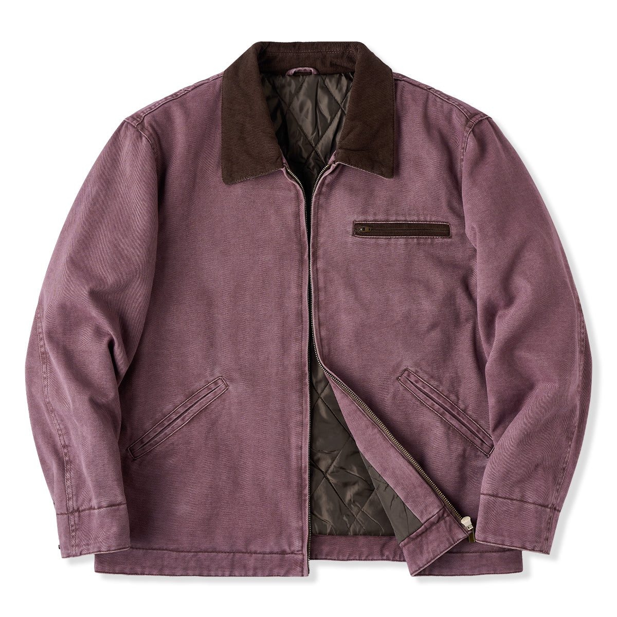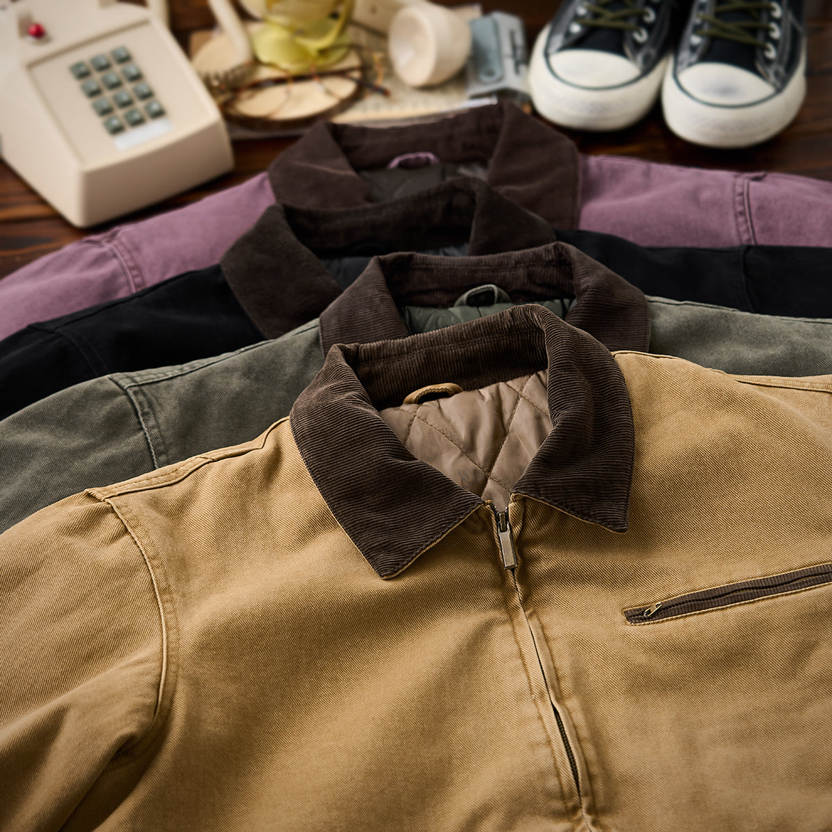 クラシックなワークジャケットをベースに、現代的な着心地へとアップデートした中綿デトロイトジャケット。特徴的なコーデュロイ襟が程よいアクセントとなり、無骨さの中に上品さをプラスします。裏地にはダイヤモンドキルト仕様の中綿ライニングを採用。軽量ながらもしっかりとした保温性を備え、冬場のアウターとして頼れる暖かさを提供します。シルエットはすっきりとしつつ、動きやすさにも配慮したバランスの良い設計。シンプルながら存在感のある、冬のワードローブに一枚は持っておきたい万能ワークジャケットです。