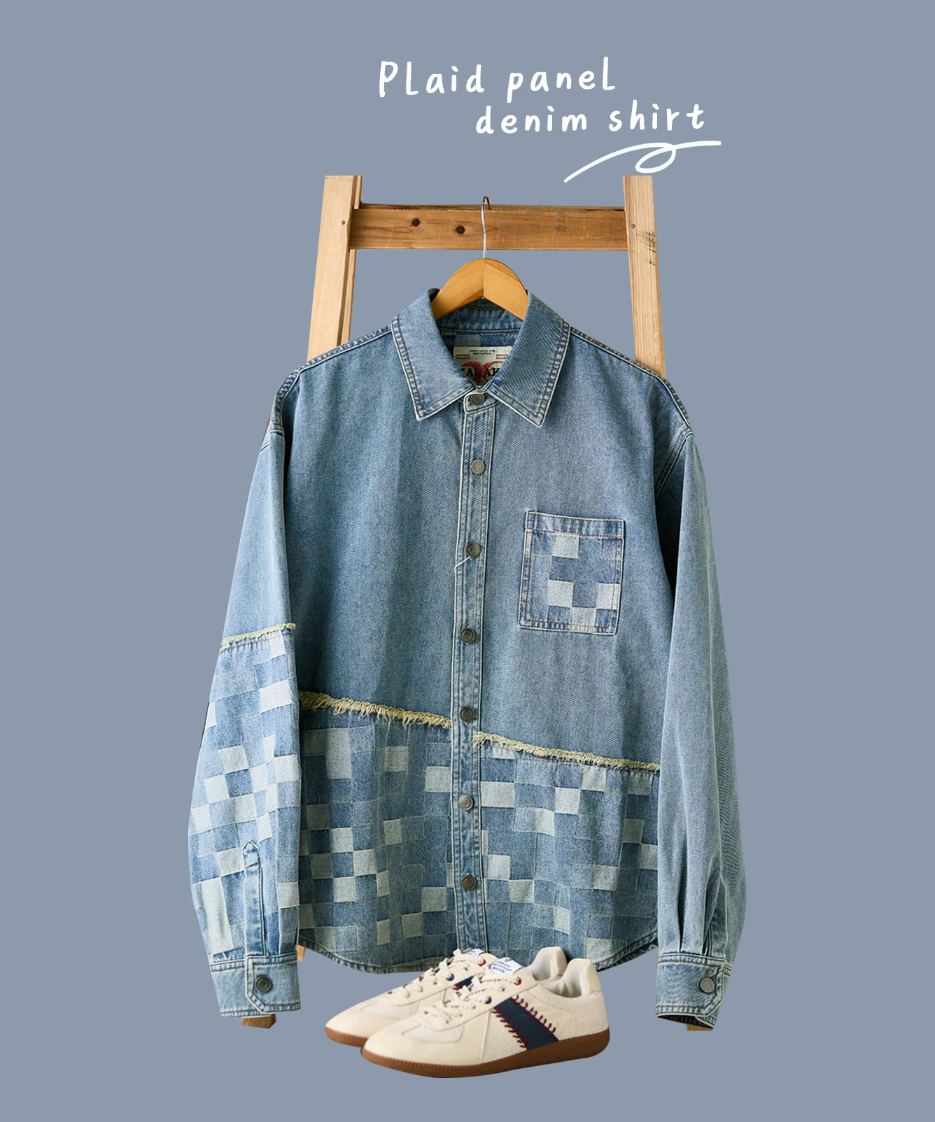 【予約】ジャガード織りチェック柄 アンティーク調ボタン付きデニムシャツ