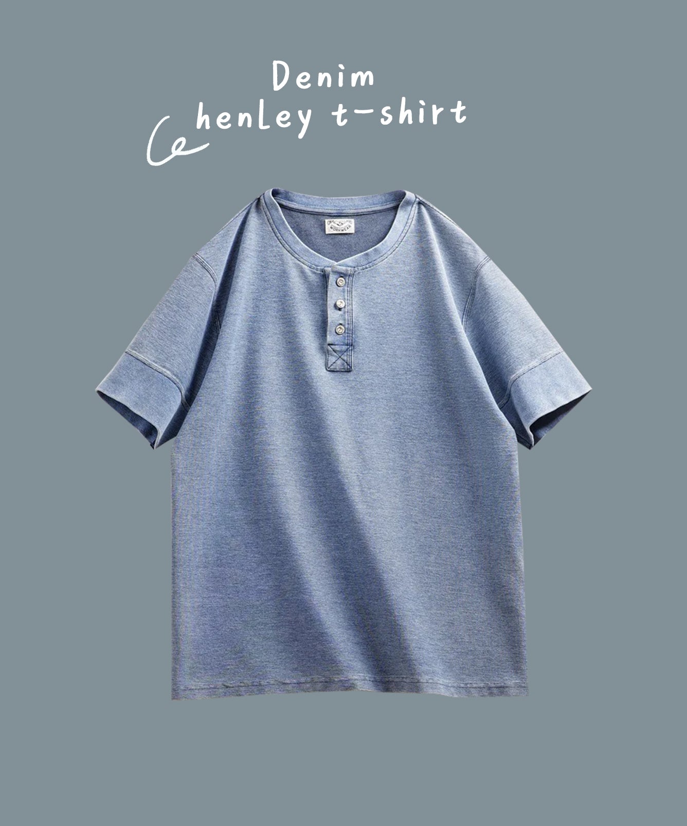 アメカジ定番 ウォッシュド加工デニムヘンリーネックTシャツ