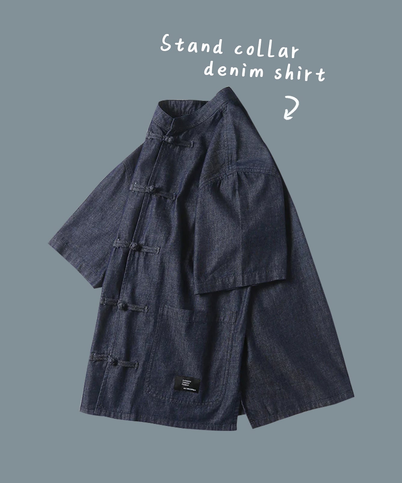 チャイナボタン スタンドカラーデニム半袖シャツ