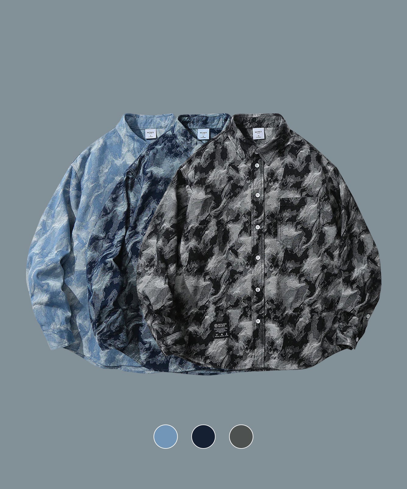 油絵風グラデーション総柄 ラグランデニムワークシャツ