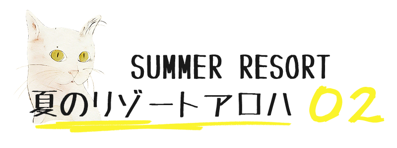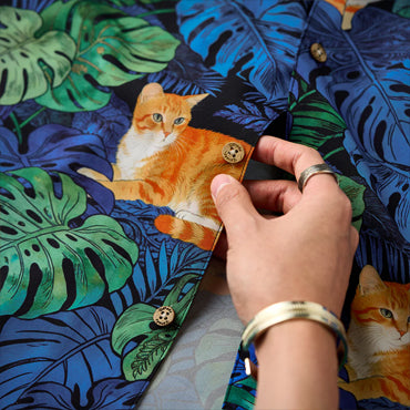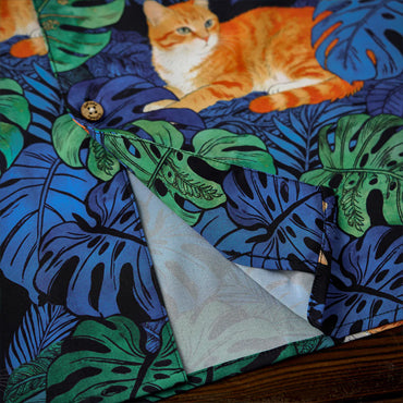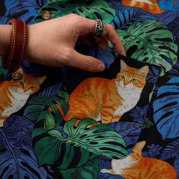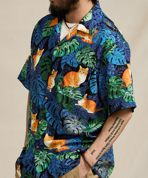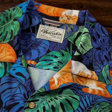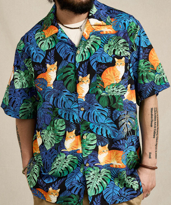 夏のリゾート気分をそのまま楽しめる、遊び心あふれる総柄アロハシャツ。鮮やかなブルーグリーンのモンステラや熱帯植物の合間で、オレンジ色の茶トラ猫がゆったりとくつろぐデザインは、目を惹く補色の配色で仕上げました。