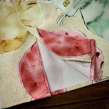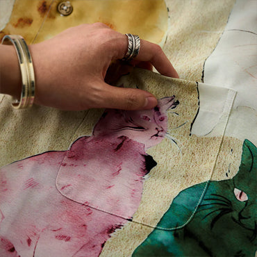 シャツ全体に、猫たちがさまざまな色彩で描かれており、ポップアートのスタイルを忠実に再現しています。猫が座ったり、寝転がったりするさまざまなポーズが取り入れられており、動きや表情の違いが楽しいデザインとなっています。