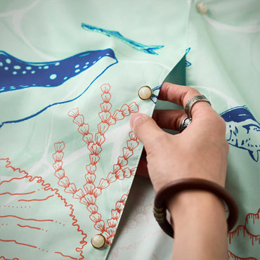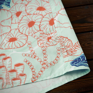 ブルーオレンジのコントラストラインで描かれたクジラやマグロ、サンゴ、貝殻などの海洋生物が、まるで海中を行進するパレードのようにリズミカルに広がる総柄デザインです。ベースには、涼やかな浅ミントグリーンを採用。そこに白い水波紋のような模様を重ねることで、海底に差し込む光の揺らめきを思わせる、透明感のある表情を演出しました。
