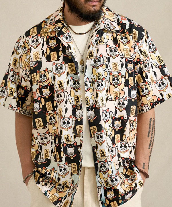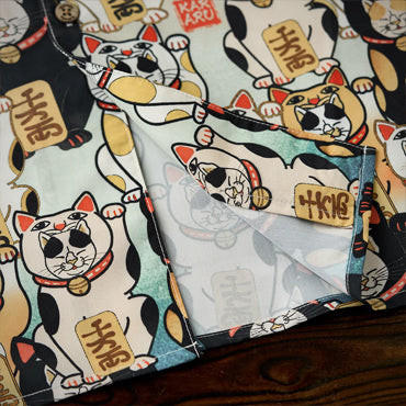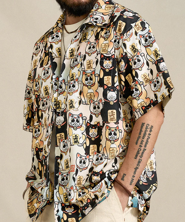 「招き猫着ぐるみをかぶった猫たち」総柄 浮世絵風アロハシャツ