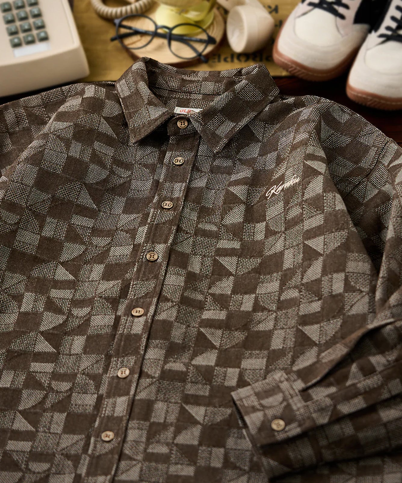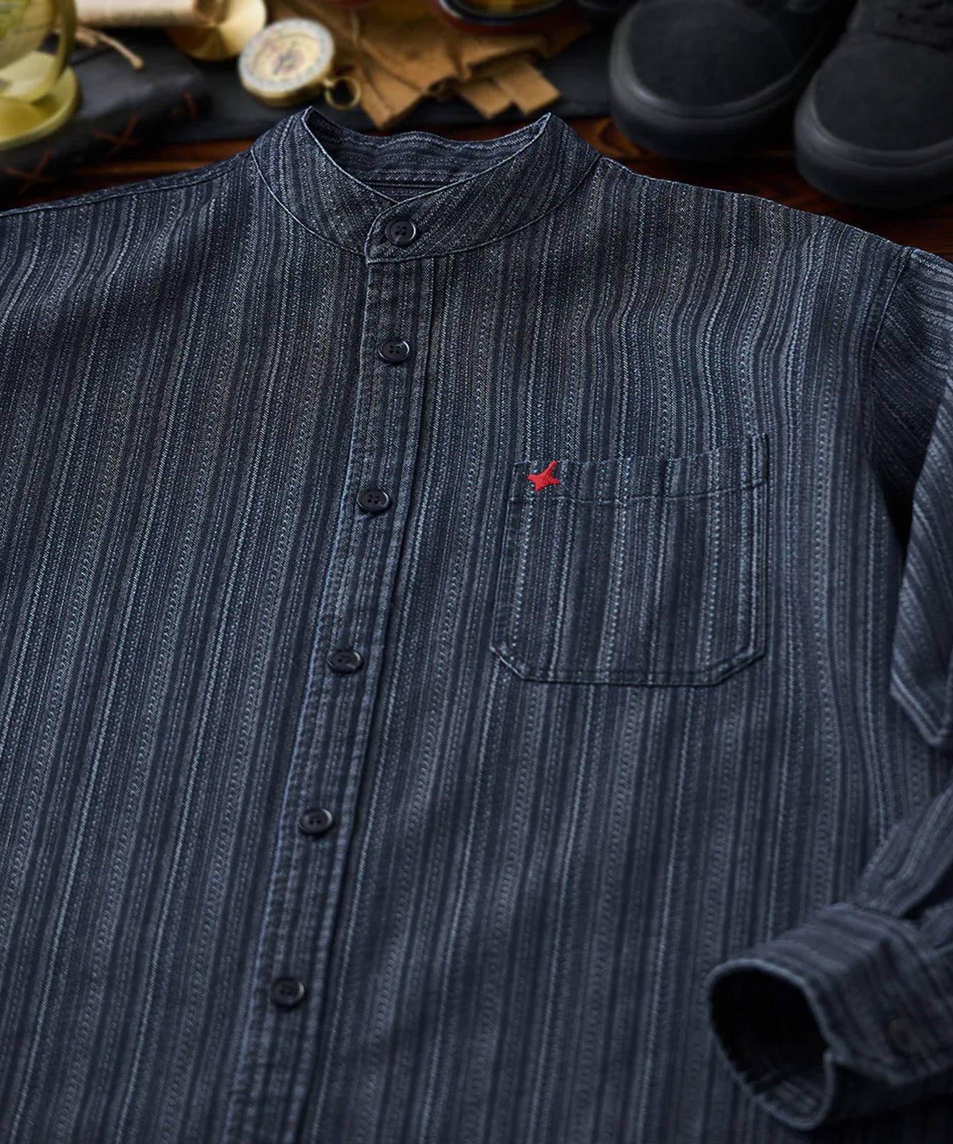 【予約】Karaku刺繍入り 赤ヒモ付き幾何学模様ジャカード織りデニムシャツ