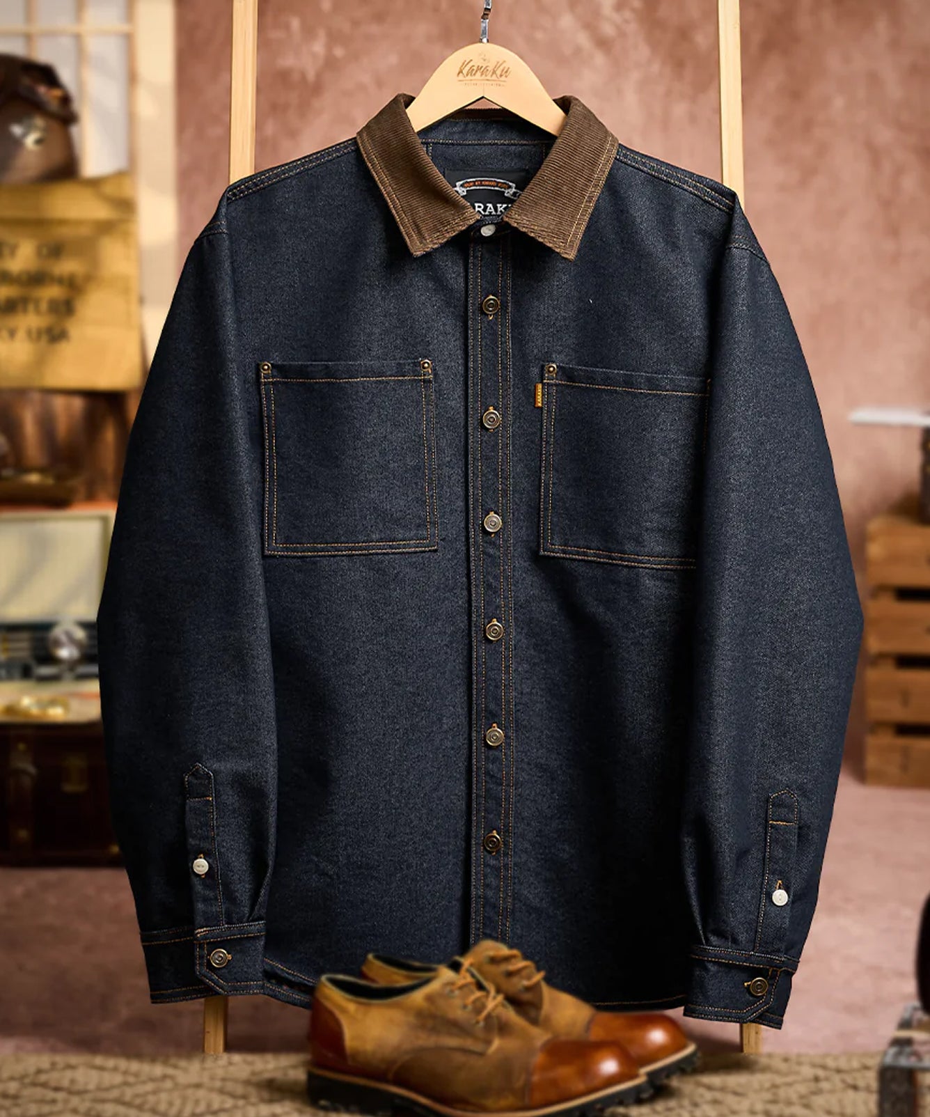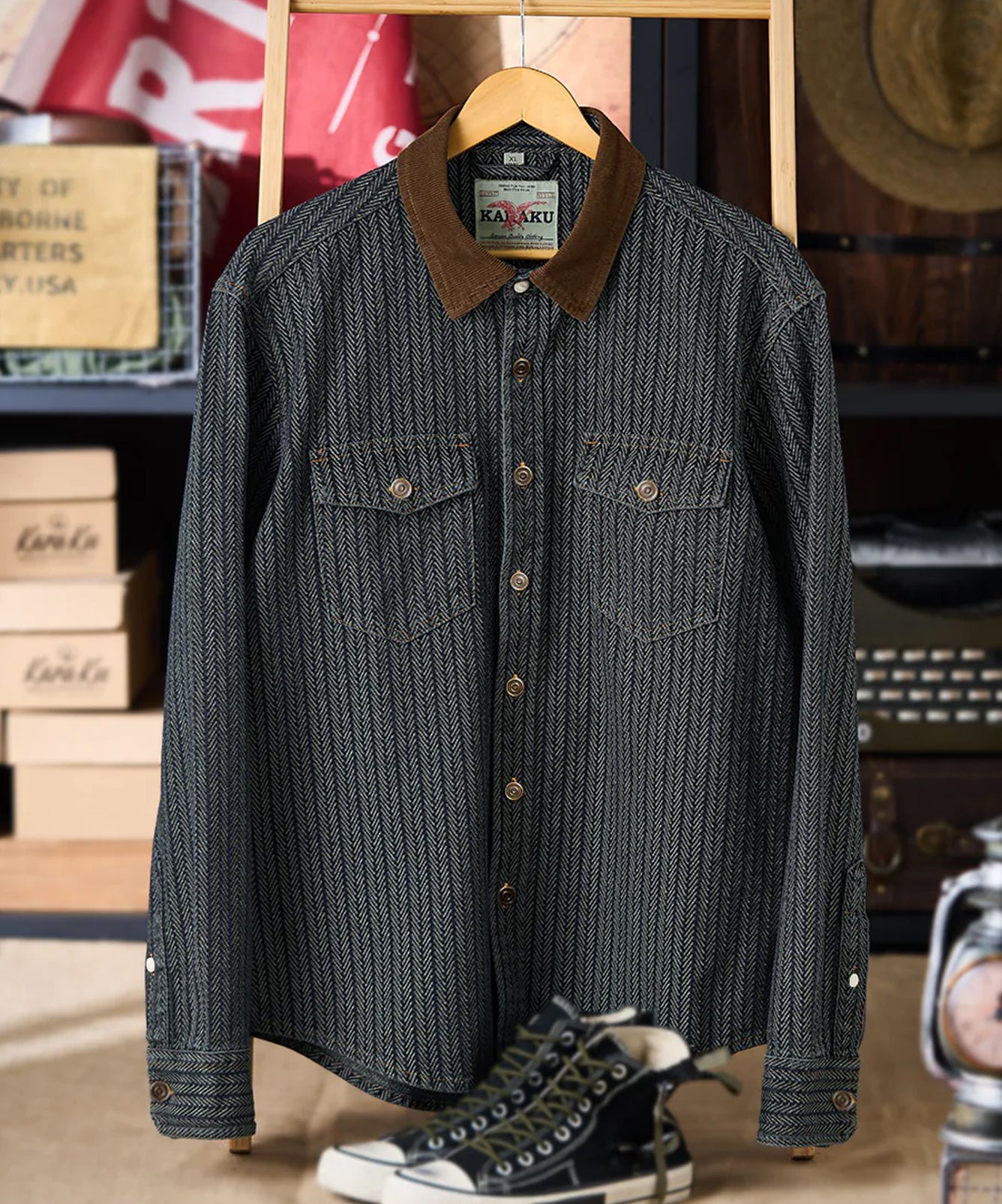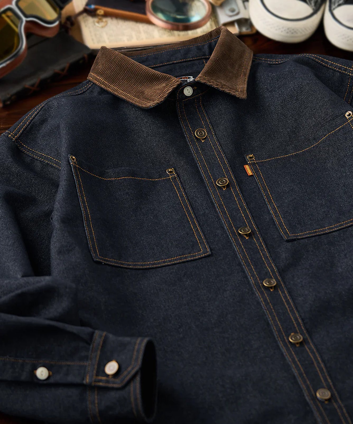 【予約】コーデュロイ襟切替 ヘリンボーンジャカード織りデニムワークシャツ